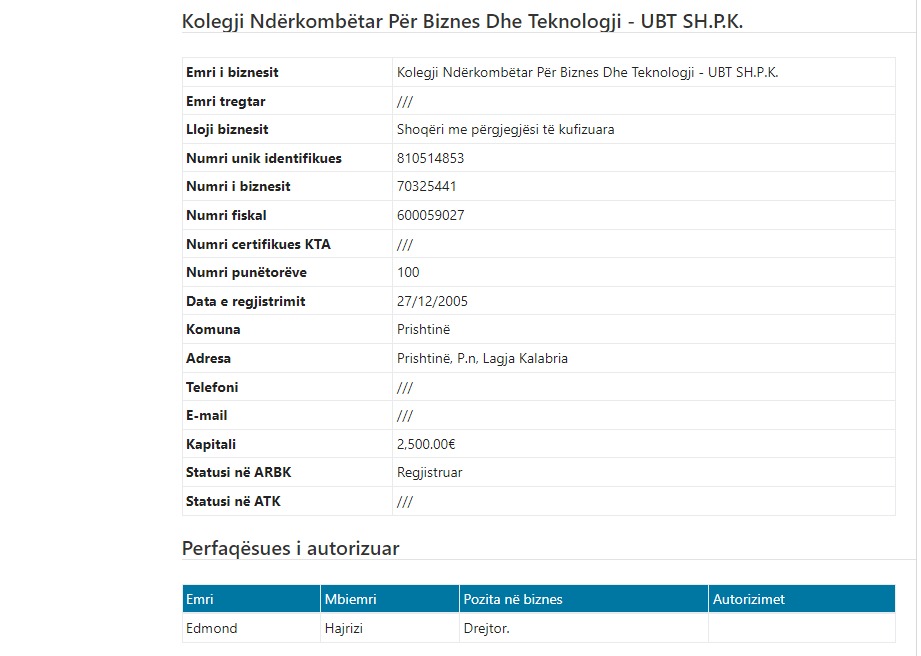 | Shoqëri e huaj për këtë subjekt: | Universiteti Nderkombetar per Biznes dhe Teknolgji, UBT sh.p.k, themeluar me 27/12/2005, me numer unik identifikues 810514853, numer biznesi 70325441, numer fiskal 600059027 dhe me seli ne Prishtinë, P.n, Lagja Kalabria. Drejtor i shoqerise se huaj Edmond Hajrizi. Sipas Ekstraktit Historik te Regjistrit Tregtar Kosovar, date 27.06.2022 Subjekti Juridik nuk ka regjistruar të dhëna në regjistrin e pronarëve përfitues RPP |