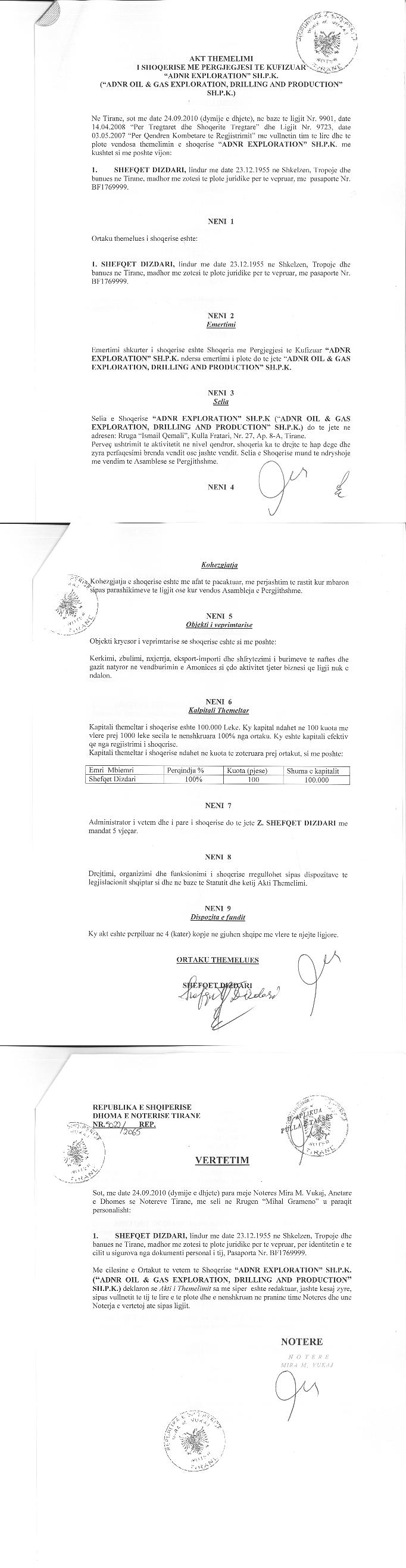 | Objekti i Veprimtarisë: | Kerkimi,zbulimi,nxjerrja,eksport-importi dhe shfrytezimi i burimeve te naftes dhe gazit natyror ne vendburimin e Amonices si çdo aktivitet tjeter biznesi qe ligji e nuk e ndalon. |