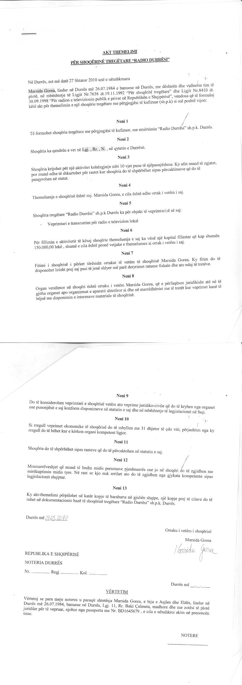 → Ekstrakti Historik I Regjistrit Tregtar date 03.08.2022 → Akt themelimi i Shoqerise "RADIO DURRËSI" → Projekti për Bashkimi me Përthithje ndërmjet Shoqërive: “RADIO DURRËSI” sh.p.k dhe “Adria Med”sh.p.k, datë 16.12.2014 → Marrëveshja për Bashkimin me Përthithje të Shoqërisë “RADIO DURRËSI” sh.p.k me shoqërinë “Adria Med”sh.p.k, datë 24.01.2015 → Kontratë Shitje Kuotash datë 08.09.2015 → Kontratë për Shitje Kuotash datë 18.09.2019 → Kontratë Shitblerje Kuotash datë 02.10.2019 → Kontratë Shitje Kuote Kapitali datë 25.07.2022 → Projekt Marrëveshje për Bashkimin me Përthithje ndërmjet “Premium Media “ sh.p.k dhe “RTV ADRIA-MED” sh.p.k, datë 13.04.2022 → Marrëveshje për Bashkimin me Përthithje ndërmjet “Premium Media “ sh.p.k dhe “RTV ADRIA-MED” sh.p.k, datë 05.10.2022 → Ekstrakt Historik i Regjistrit Tregtar date 16.09.2025 |