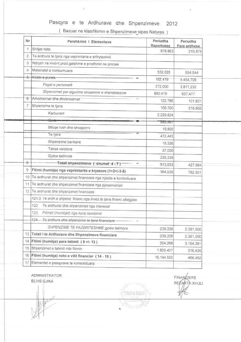 Xhiro Vjetore(Lekë) 2017:166 583 150,00 Xhiro Vjetore(Lekë) 2016:349 672 988,00 Xhiro Vjetore(Lekë) 2015:471 640 292,00 Xhiro Vjetore(Lekë) 2014: 426 281 540,00 Xhiro Vjetore(Lekë) 2013: 386 407 597,00 Xhiro Vjetore(Lekë) 2012: 343 878 863,00 Xhiro Vjetore(Lekë) 2011: 213 210 875,00 Xhiro Vjetore(Lekë) 2010: 9 479 242,00 |