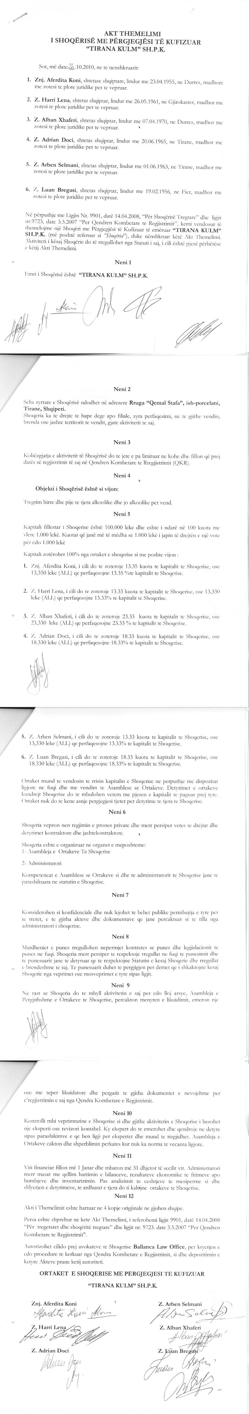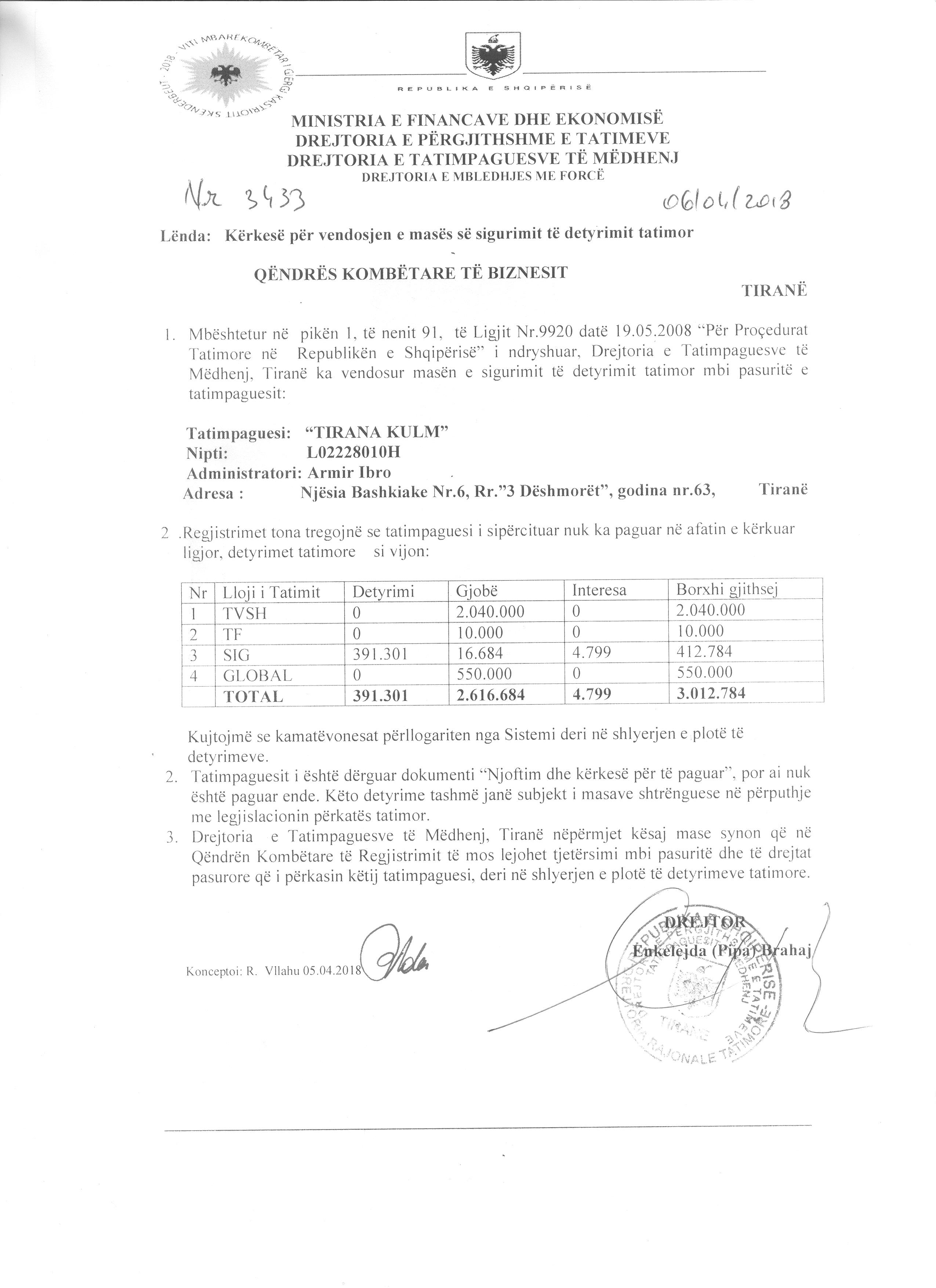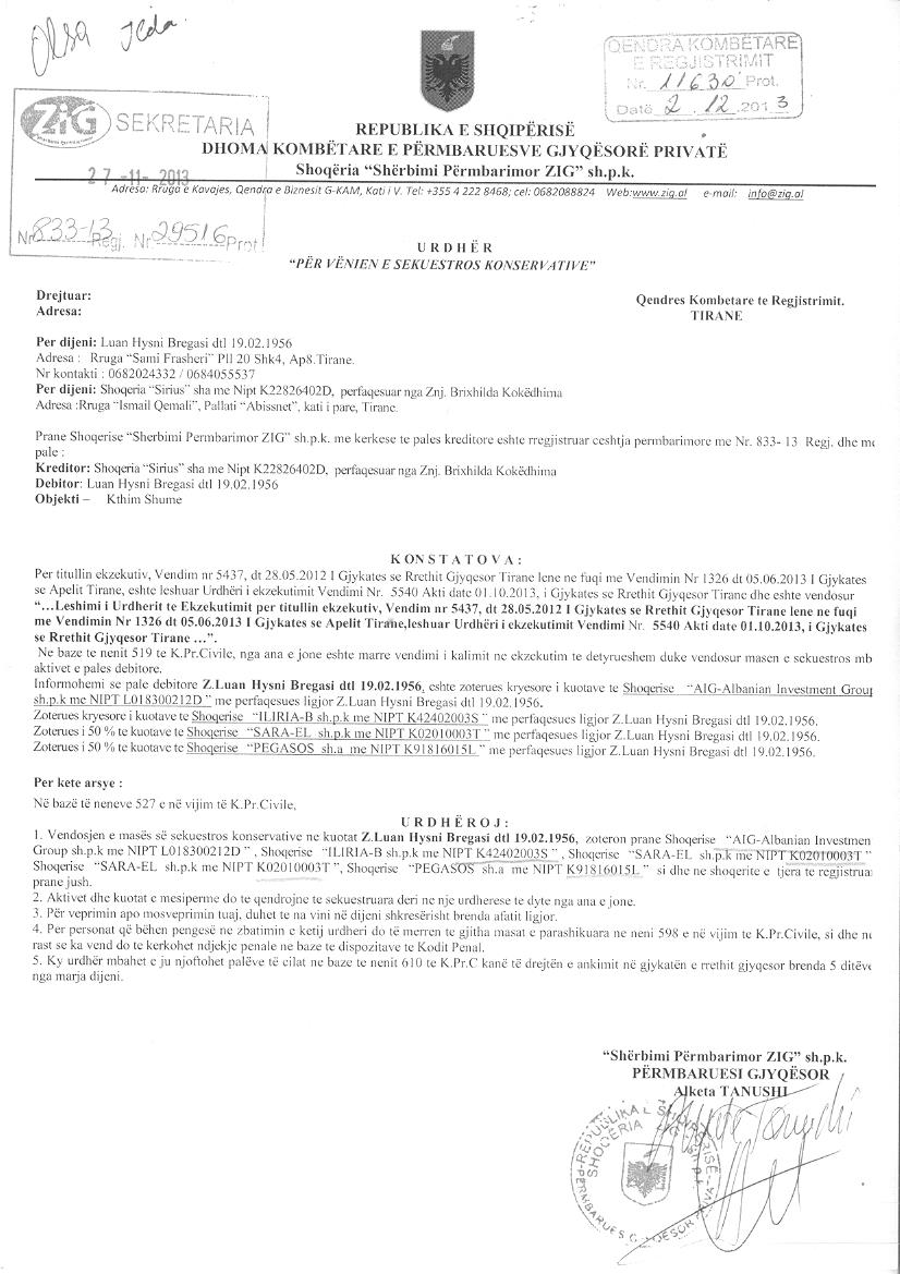 → Ekstrakt Historik i Regjistrit Tregtar date 13.08.2023 → Akt themelimi i Shoqerise → Urdhër për Vënien e Sekuestros datë 27.11.2013 → Urdhër për Vënien e Sekuestros datë 01.12.2017 → Kërkesë për Vendosjen e Sigurimit Tatimor datë 06.04.2018 → Urdhër për Vënien e Sekuestros datë 02.02.2021 → Urdhër për Vënien e Sekuestros datë 12.02.2021 → Urdhër për Heqjen e Sekuestros datë 23.03.2021 → Urdhër për Heqjen e Sekuestros datë 31.10.2022 → Kërkesë për Vendosjen e Sigurimit Tatimor datë 11.02.2022 |