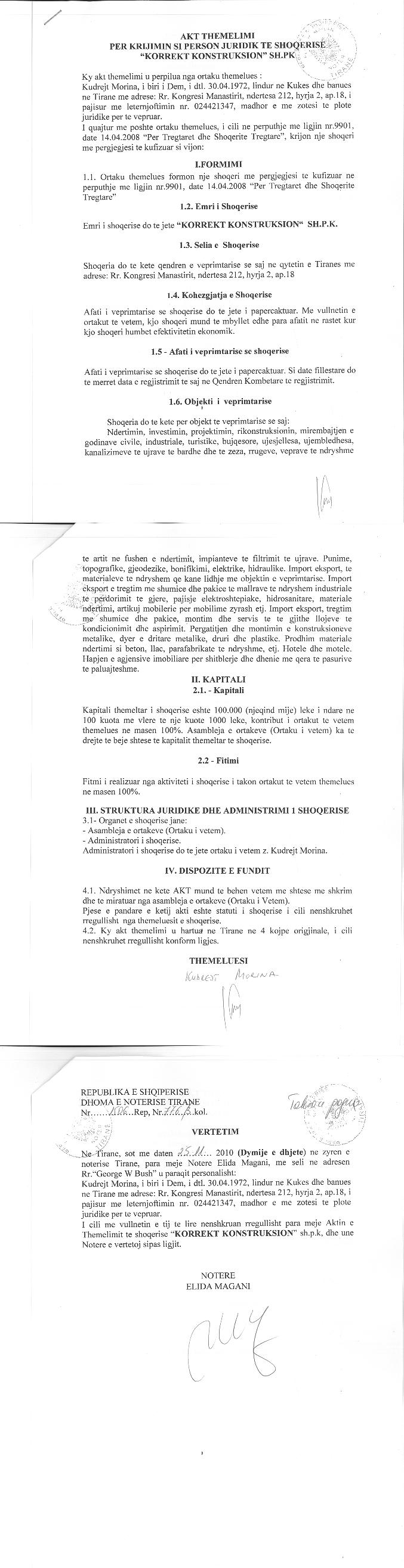 → Ekstrakt Historik i Regjistrit Tregtar date 10.05.2023 → Akt themelimi i Shoqerise → Kontrate Shitje Kuotash date 01.08.2011 → Kontrate Shitje Kuotash date 14.09.2012 |
