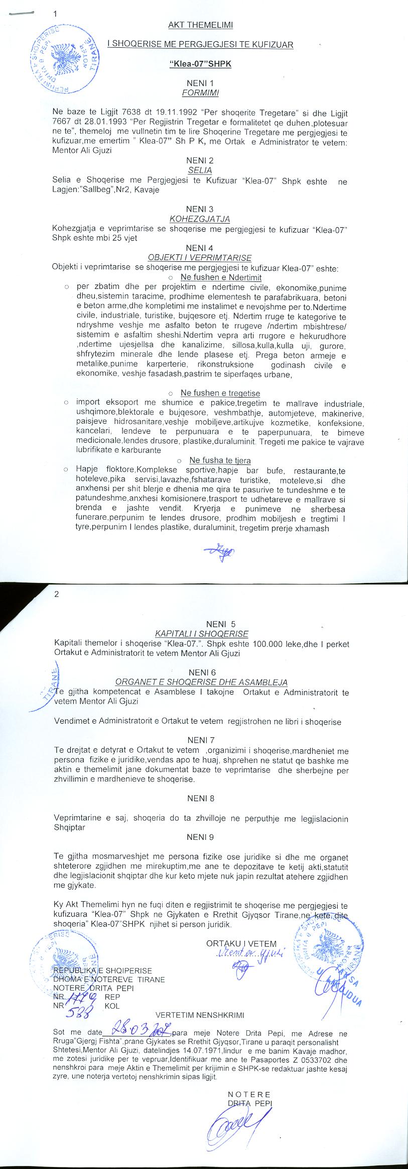 → Ekstrakti Historik i Regjistrit Tregtar date 16.08.2022 → Akt themelimi i Shoqerise |