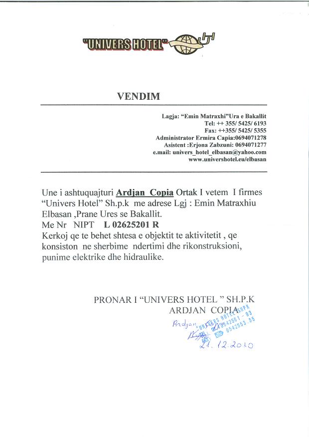 | Objekti i Veprimtarisë: | Sherbime hotelerie dhe restoranterie.Organizim sherbime turistike te ndryshme.aktivitetesh kulturore dhe argetuese, kursesh trajnimi per sherbime turistike dhe restoranterie per profesioniste te sektorit dhe te rinj qe duan te lidhen ne te .Organizim aktivitetesh sportive dhe turizmi natyror, guide turistike, projektim, informacion turistik.Sherbime ndertimi dhe rikonstruksioni, punime elektrike dhe hidraulike. Sherbime lavandarie dhe sherbime katering. |