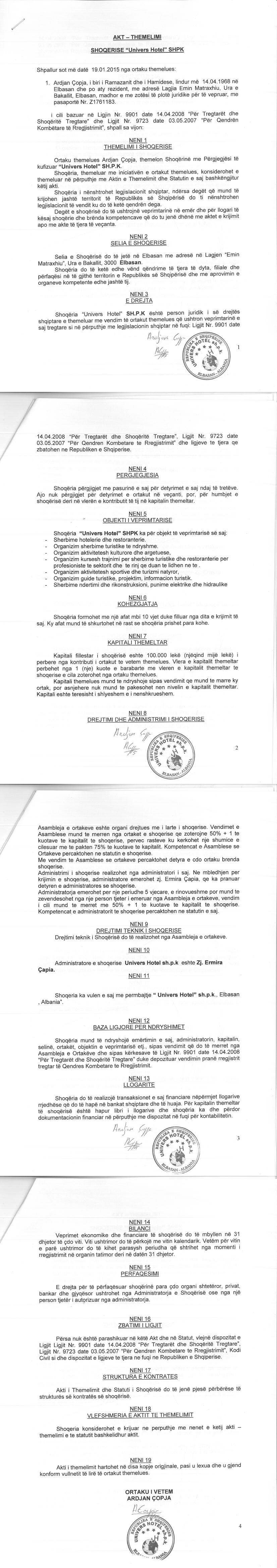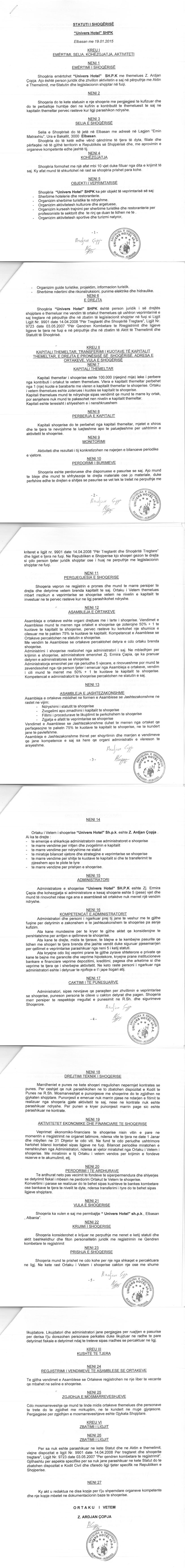 → Ekstrakt Historik i Regjistrit Tregtar, date 6.1.2022 → Vendimi i ortakut te vetem, date 22.12.2010 → Akt themelimi, date 19.01.2015 → Statuti i shoqerise, date 19.01.2015 → Vendimi i ortakut te vetem, date 30.04.2020 |