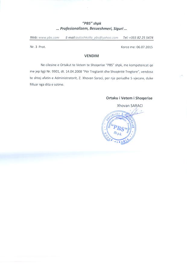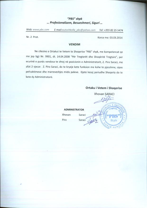 | Shënime: | 1.Depozitimi i Vendimit te Asamblese se Ortakeve nr.1 dt. 31.05.2010 per emerimin e Drejtueses Teknike Znj. Belkize Saraçi me nr. Deshmie 2537 dt. 29.09.2006 ne funksioin e mesuesit te teorise. 2.Depozitimii i vendimit nr. 3, date 21.06.2010 per lirimin nga detyra e drejtuesit teknik te znj. Belkize Saraçi dhe emerimin e Drejtuesit Teknik Z.Dhimitraq Ziu me Nr.Deshmie 2429, date 30.06.2006. 3.Depozitimi i vendimit nr. 7 dt. 20-12-2010 per shkarkimin e drejtuesit teknik Dhimitraq Ziu dhe emerimin e drejtueses teknike znj. Belkize Saraçi |