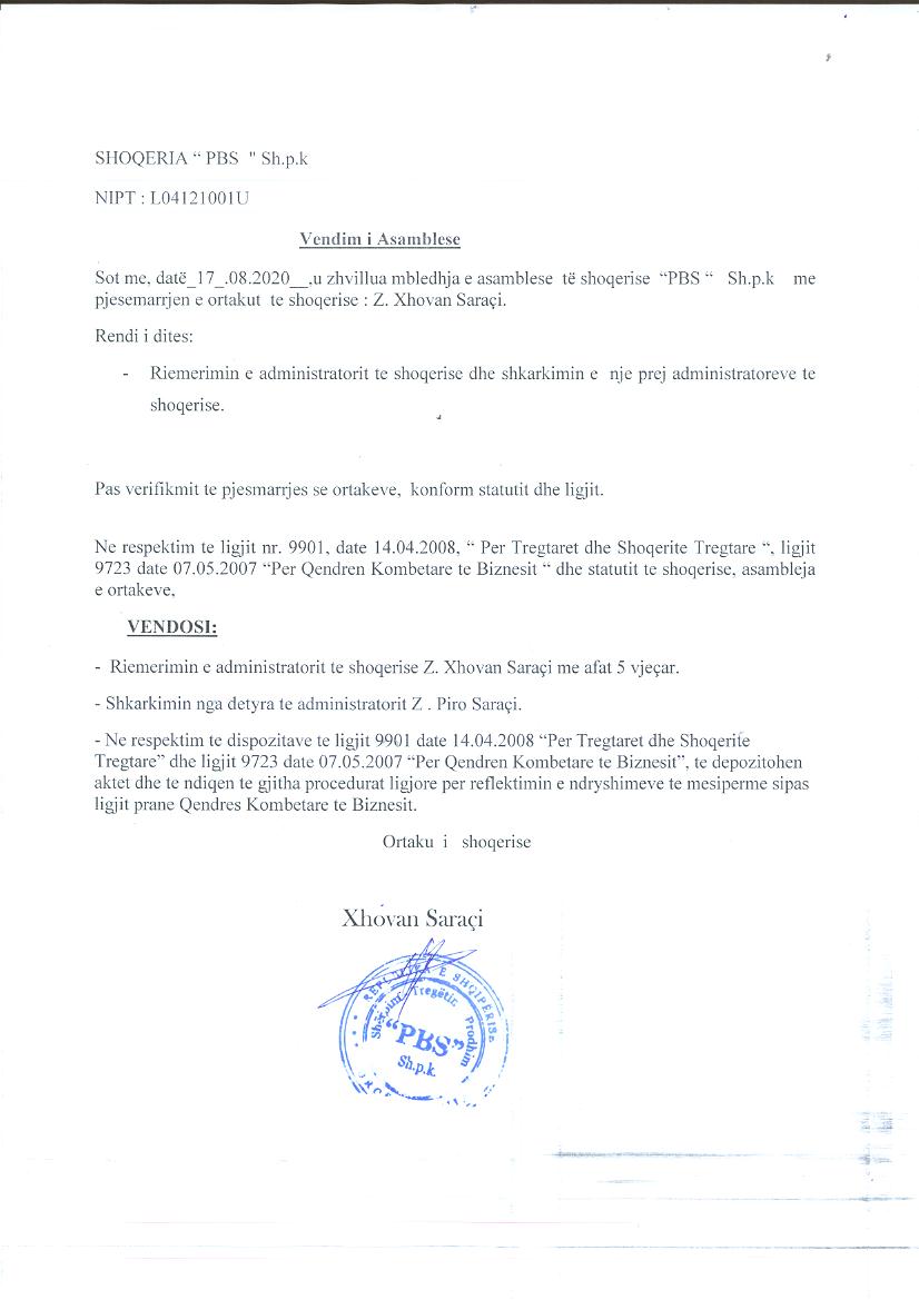 → Ekstrakt Historik i Regjistrit Tregtar, date 22.12.2021 → Statusi i shoqerise, date 14.05.2010 → Vendimi i asambles se pergjithshme , date 03.03.2014 → Vendimi i ortakut te vetem, date 06.07.2015 → Vendimi i ortakut te vetem, date 17.08.2020 |