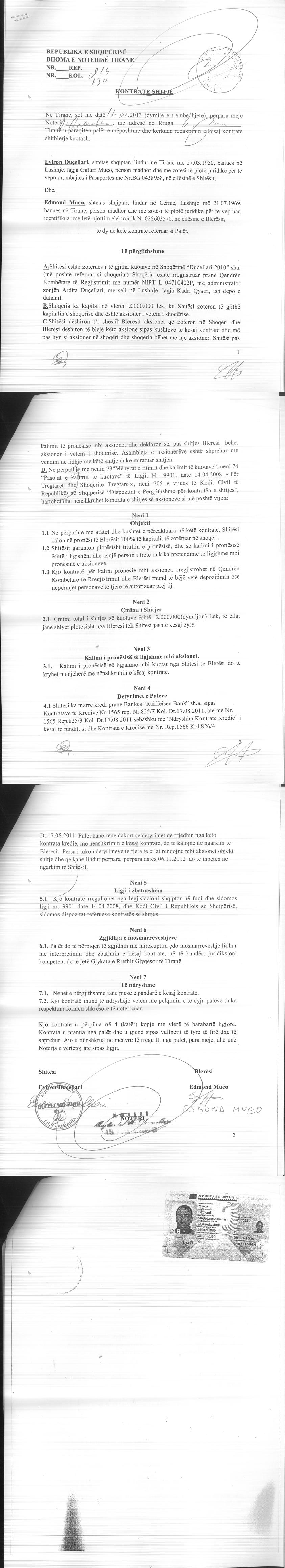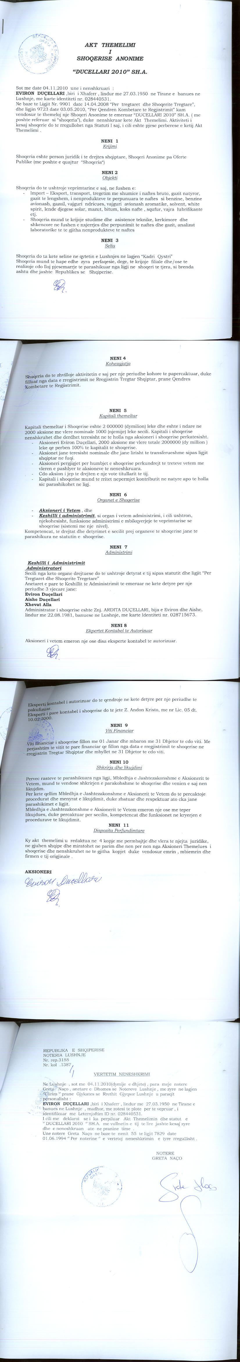 → Ekstrakt Historik i Regjistrit Tregtar date 07.09.2022 → Akt themelimi i Shoqerise → Kontrate Shitje Kuotash date 17.01.2013 → Vendim i Aksionerit te Vetem, Zmadhim Kapitali date 30.07.2013 → Urdhra per Venie Sekuestro date 01.10.2013 → Urdhra per Heqje Sekuestro date 10.03.2014 |