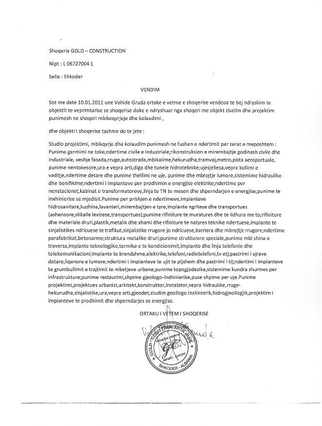 | Objekti i Veprimtarisë: | Studio projektimi, mbikqyrje dhe kolaudim punimesh ne fushen e ndertimit per zerat e meposhtem : Punime germimi ne toke,ndertime civile e industriale;rikonstruksion e mirembajtje godinash civile dhe industriale, veshje fasada, rruge, autostrada, mbikalime, hekurudha, tramvaj, metro, pista aeroportuale, punime nentokesore,ura e vepra arti,diga dhe tunele hidroteknike;ujesjellesa,vepra kullimi e vaditje,ndertime detare dhe punime thellimi ne uje, punime dhe mbrojtje lumore,sistemime hidraulike dhe bonifikime;ndertimi i impianteve per prodhimin e energjise elektrike;ndertime per nenstacionet,kabinat e transformatoreve,linja te TN te mesen dhe shperndarjen e energjise;punime te inxhinierise se mjedisit.Punime per prishjen e ndertimeve,impianteve hidrosanitare, kuzhina, lavanteri, mirembajtjen e tyre,impiante ngritese dhe transportues (ashensore,shkalle levizese,transportues);punime rifiniture te muratures dhe te lidhura me to;rifiniture dhe materiale druri,plastik,metalik dhe xhami dhe rifiniture te natyres teknike ndertuese,impiante te sinjalistikes ndricuese te trafikut,sinjalistike rrugore jo ndricuese,barriera dhe mbrojtje rrugore; ndertime parafabrikat,betonarme;struktura metalike druri;punime strukturore speciale,punime mbi shina e traversa,impiante teknologjike,termike e te kondicionimit,impiante dhe linja telefonie dhe telekomunikacioni;impiante te brendshme,elektrike,telefoni,radiotelefoni,tv etj;pastrimi i ujrave detare,liqenore e lumore;ndertimi i impianteve te ujit te pijshem dhe pastrimi i tij;ndertimi i impianteve te grumbullimit e trajtimit te mbetjeve urbane;punime topogjodezike;sistemime kundra zhurmes per infrastrukture;punime restaurimi,shpime gjeologoinxhinierike,puse shpime per uje.Punime projektimi,projektues urbanist, arkitekt, konstruktor, instalator, vepra hidraulike,rruge-hekurudha, sinjalistike, ura,vepra arti,gjeodet,studim geollogo inxhinierik,hidrogjeollogjik,projektim i impianteve te prodhimit dhe shperndarjes se energjise. Punime gërmimi në tokë. Ndërtime civile dhe industrial. Rikonstruksion dhe mirëmbajtje godinash civile e industriale, veshje fasada. Rruge, autostrada, mbikalime, hekurudha, tramvai, metro, pista aeroportuale. Punime nëntoksore, ura e vepra arti. Diga dhe tunele hidroteknike. Ujesjellësa, gazsjellesa, vajsjellësa, vepra kullimi e vaditje. Ndërtime detare dhe punime thellimi në ujë. Punime dhe mbrojtje lumore sistemime hidraulike dhe bonifikime. Ndërtimi i impiantevë per prodhimin e energjise elektrike. Ndërtime per N/stacionet, kabinat e transformatorëve linja e TN e të mesëm dhe shperndarjen e energjise. Punime te inxhinierisë se mjedisit. Punime per prishjen e ndërtimeve. Impiante hidro-sanitare, kuzhina, lavanteri, mirëmbajtja e tyre. Impiante ngritese dhe transportues (ashensore, shkallë levizëse, transportues). Punime rifiniture të muraturës dhe te lidhura me to, rifiniture me materiale druri, plastik, metalik dhe xhami dhe rifiniture te natyrës teknike ndërtuese. Impiante të sinjalistikës ndricuese te trafikut. Sinjalistika rrugore jo ndricuese. Barrierra dhe mbrojtje rrugore. Ndërtime parafabrikat beton arme, struktura metalike dhe druri. Punime strukturorë speciale. Shtresa dhe mbistruktura speciale. Punime mbi shina dhe traversa. Impiante teknologjik, termike dhe te kondicionimit. Impiante dhe linja telefonie dhe telekomunikacioni. Impiante te brendëshme, elektrike, telefoni, radiotelefoni TV etj. Pastrimi i ujrave detarë, liqenor dhe lumor. Ndërtimi i impianteve te ujit te pijshem dhe pastrimit te tij. Ndërtimi i impianteve te grumbullimit dhe trajtimit te mbetjeve urbane. Punime topogjeodezike. Sistemet kundra zhurmes per infrastructure. Shpime gjeologo-inxhinierike, puse e shpime per uje. Importeksport: makineri dhe pajisje. madhra dhe ushqime. materiale industriale. minerale dhe lende drusore. Prodhim dhe shitje mobilerie dhe produkte druri. Veprimtari ne fushën e turizmit. Asistence teknike në fushën e projektimit dhe ndertimit. Rritje dhe tregtim fidanesh. Tregtim me shumice dhe pakice te madhrave te ndryshme elektroshtepiake, elektronike, hidraulike, gjeneratora dhe transformatora. |