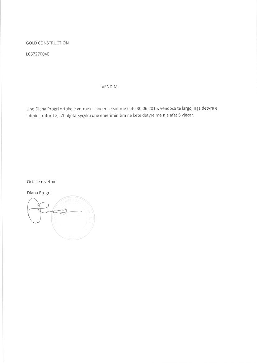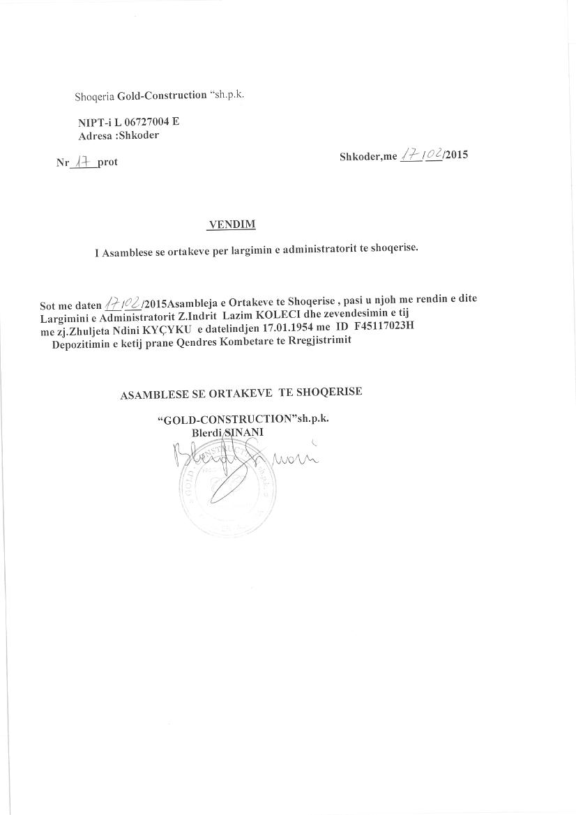 → Ekstrakt Historik i Regjistrit Tregtar, date 7.1.2022 → Vendimi i asamblese se ortakeve, date 10.1.2011 → Kontrate e shitjes se kuotave , date 12.09.2011 → Vendimi i asamblese se ortakeve, date 10.10.2013 → Vendimi i asamblese se ortakeve, date 17.02.2015 → Kontrate e shitjes se kuotave, date 29.06.2015 → Vendimi i asamblese se ortakeve, date 10.06.2015 → Vendimi i asmablese se ortakeve, date 23.01.2017 → Vendimi i asamblese se ortakeve, date 23.01.2018 → Vendimi i asamblese se ortakeve, date 18.07.2018 → Vendimi i ortakut te vetem, date 25.04.2019 |