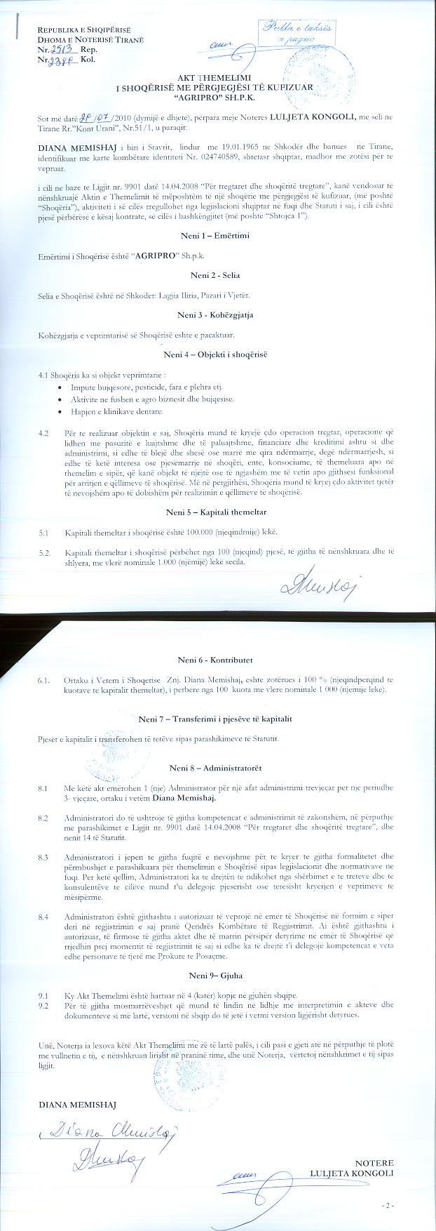 | Objekti i Veprimtarisë: | Inpute bujqesore, pesticide, fara e plehra, aktivitete ne fushen e agro biznesit dhe bujqesise, hapjen e klinikave dentare. Operacione qe lidhen me pasurite e luajtshme dhe te paluajtshme, financiare dhe kreditimi ashtu si dhe administrimi si dhe te bleje dhe shese ose marre me qira ndermarrje, dege ndermarrjesh si dhe te kete interesa ose pjesemarrje ne shoqeri, ente, konsociume te themeluara apo ne themelim e siper qe kane objekt te njejte ose te ngjashem me te vetin. Tregeti e bleteve (bumble bee) per pjalmim ne fushen e bujqesise (tregti e kafsheve te gjalla me shumice).Aktivitet te ndertimit te serave per prodhim perimesh etj. |