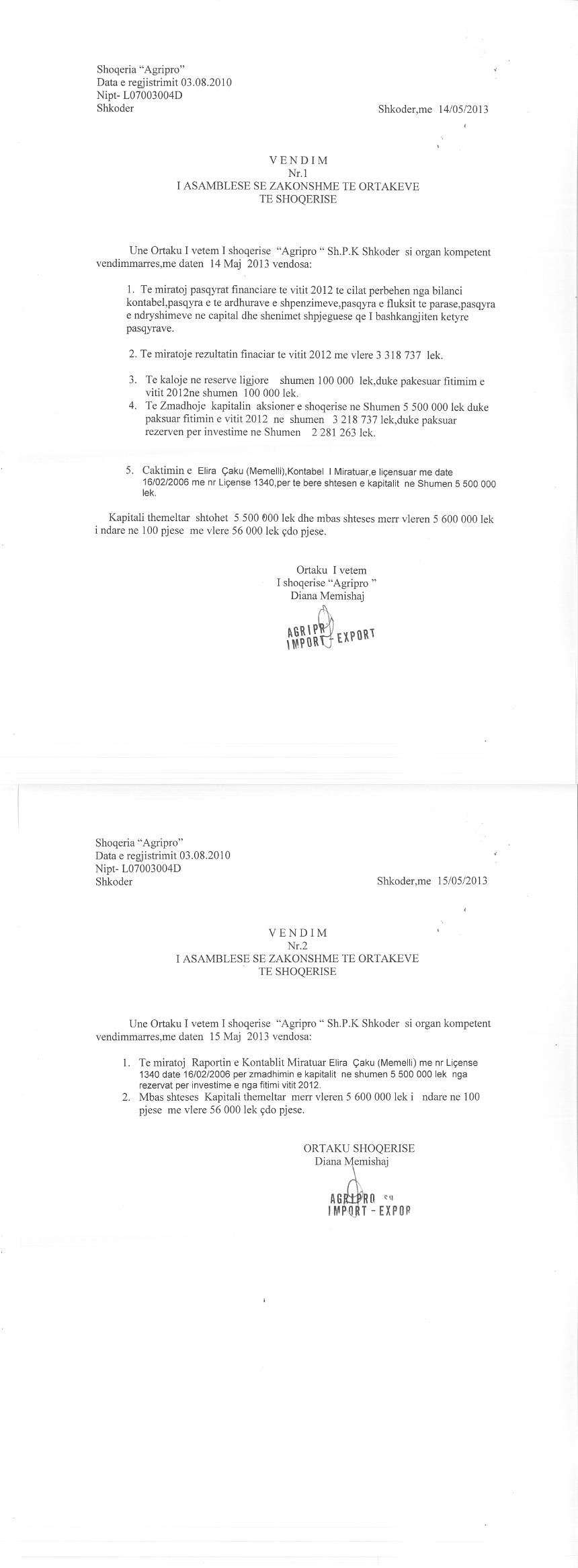 → Ekstrakt Historik i Regjistrit Tregtar date 02.10.2023 → Akt themelimi i Shoqerise → Vendim i Ortakut të Vetëm, Zmadhim Kapitalit datë 14.05.2013 → Ekstrakt Historik i Regjistrit Tregtar date 16.04.2024 → Të dhënat e Investimit, Financimet Nga IPARD - Aksesuar nga Agjencia për Zhvillim Bujqësor dhe Rural AZHBR datë 17.04.2024 |