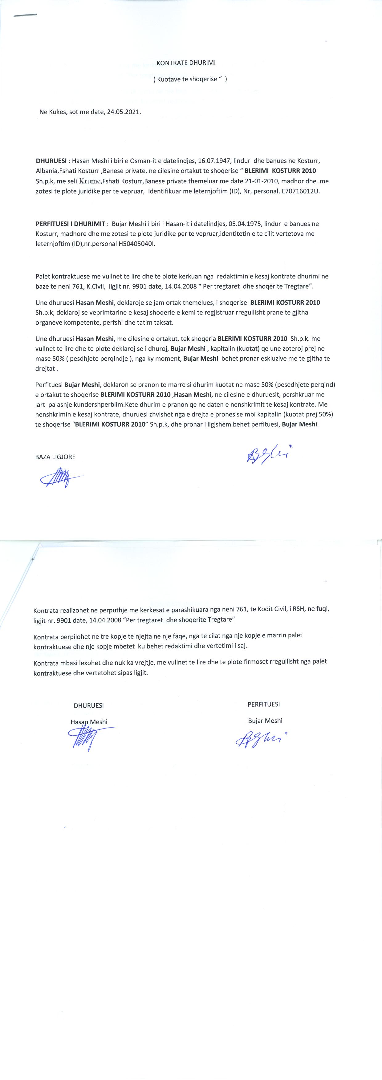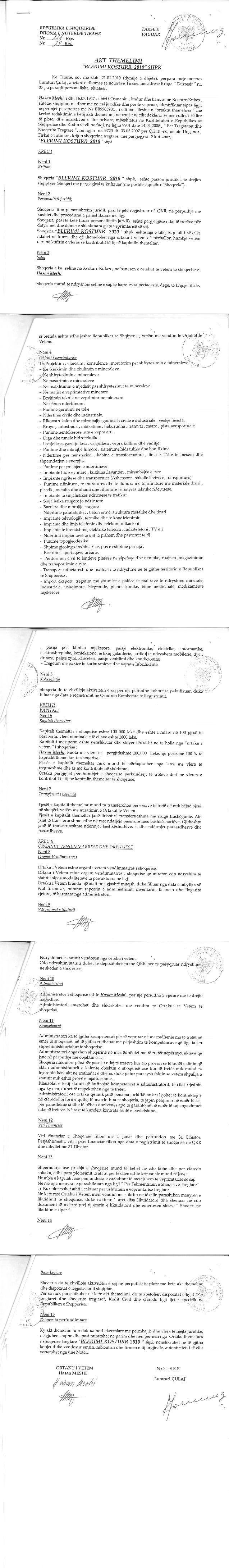 → Ekstrakt historik i regjistrit tregtar 13.07.2021 → Akti i themelimit → Kontrate dhurimi date 24.05.2021 → Vendimi i ortakut te vetem per pezullimin e aktivitetit date 27.01.2010 |