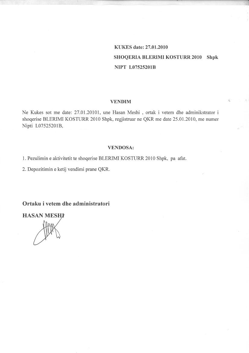 | Emërtime të tjera Tregtare: | BLERIMI KOSTURR 2010 |