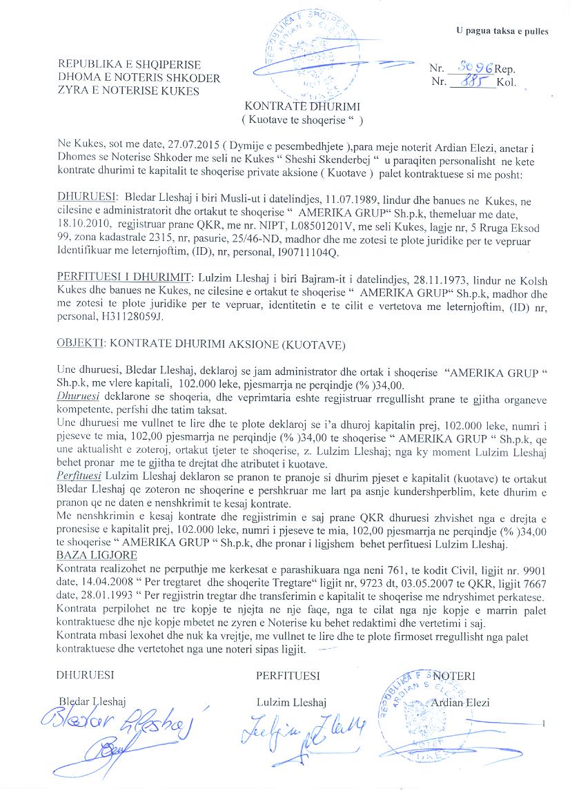 → Ekstrakt Historik i Regjistrit Tregtar date 21.02.2023 → Akt themelimi i Shoqerise → Kontrate Dhurimi Kuotash date 27.07.2015 |