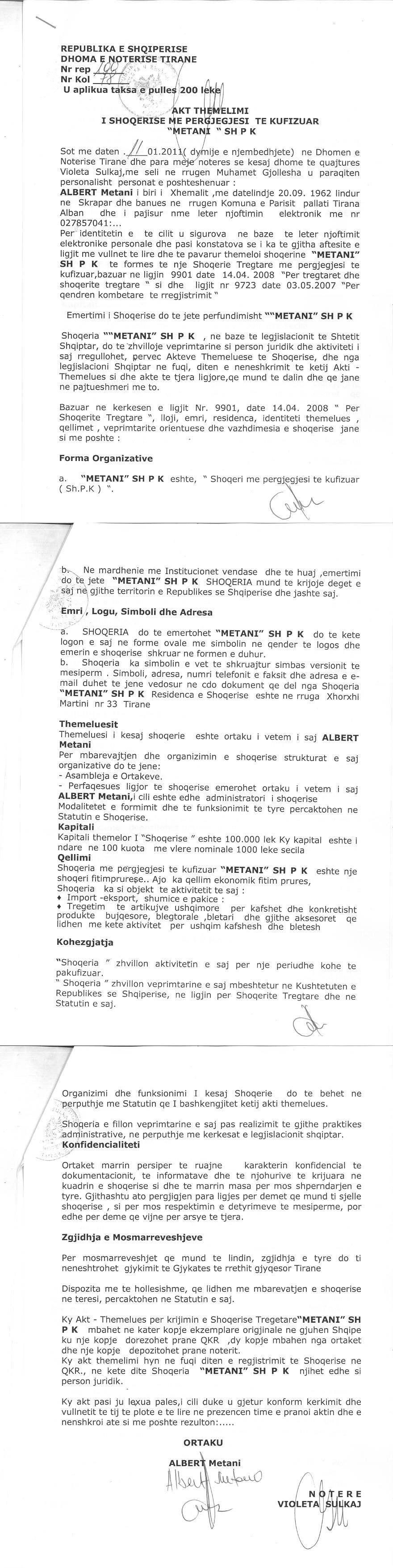 | Çështje Ligjore: | Me date 26/05/2015, me ane te Marrëveshjes së Pengut “Mbi kuotat”, datë 15.05.2015, Nr. 1931 Rep., Nr. 925 Kol., e lidhur midis Albert Metani dhe Engjellushe Metani (Pengdhënësit) dhe Alpha Bank sh.a (Pengmarrës/ Kredidhënës) me objekt krijimin e një pengu, ku me anën e të cilit, në mënyrë të pakthyeshme, japin peng Aksionet/ Kuotat, në favor të kredidhënësit, në mënyrë të pakthyeshme bien dakort për dhënien dhe krijimin e një pengu mbi kuotat e pjesëmarrjes në shoqëri dhe të drejtat e lidhura mbi to në favor të kredidhënësit Alpha Bank sha.a dhe cdo aksion/ kuote e re e shoqërisë ose të drejtat që lidhen me to që mund të zotërohen në të ardhmen nga pengdhënësit. |