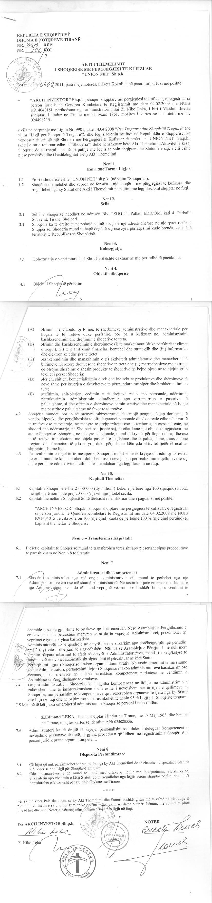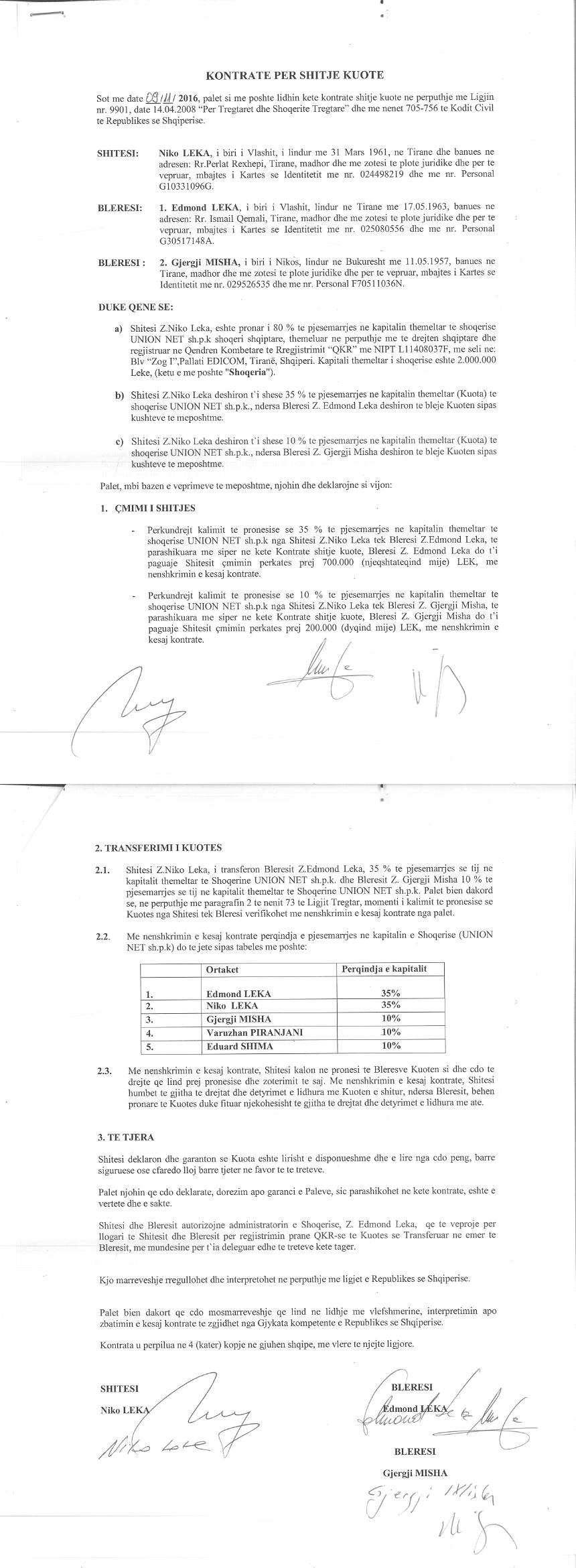 → Ekstrakt Historik i Regjistrit Tregtar date 08.04.2023 → Akt themelimi i Shoqerise → Kontratë për transferimin e kuotave datë 04.09.2014 → Kontratë për transferimit e kuotave datë 09.11.2016 → Vendim i Asamblesë së Ortakëve, Bashkimi me Përthithje datë 27.05.2020 → Projekt për Bashkimin me Përthithje të Shoqërive Tregtare "UNION GRUP" sha dhe "UNION NET" sha → Marrëveshje për Bashkimin e Shoqërive Tregtare |