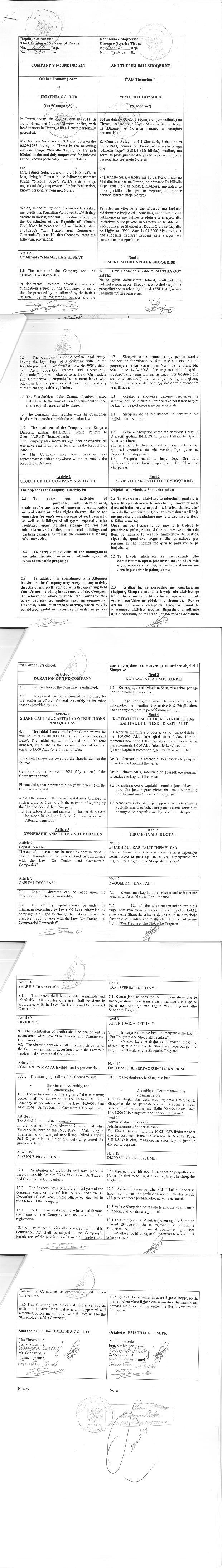 | Objekti i Veprimtarisë: | Te merret me aktivitete te ndertimit, punime te tjera te specializuara te ndertimit, kompletimete te tjera ndertimore, te negocimit, blerjes, shitjes dhe/ose cdo lloj veprimtarie tjeter te nevojshme ne lidhje me pasurite e palujtshme apo te te drejtave te tjera te lidhura me to; Operimin per llogari te vet apo te te treteve te pasurive te paluajtshme , si dhe ndertesave te cfaredo lloji, ne menyre te vecante ambjenteve te shitjes, riparimit, qendrave tregtare dhe garazheve per parkim, si dhe dhenien me qira te pasurive te paluajtshme;Te kryeje aktivitete te menaxhimit dhe administrimit, apo te jete investitor, ne ndertimin e godinave te cdo lloji, te realizoje dhenien me qira te pasurive te paluajtshme; Gjithashtu, ne perputhje me legjislacionin shqiptar, shoqeria mund te kryeje cdo aktivitet qe lidhet direkt ose indirekt me fushen operuese qe nuk eshte i perfshire ne objektin e shoqerise. Per te arritur qellimin e mesiperm, shoqeria mund te ndermarre aktivitet tregtar, financiar, qiradhenie apo hipotekimi, qe mund te konsiderohet i dobishem qe te arrihet objekti i shoqerise. |