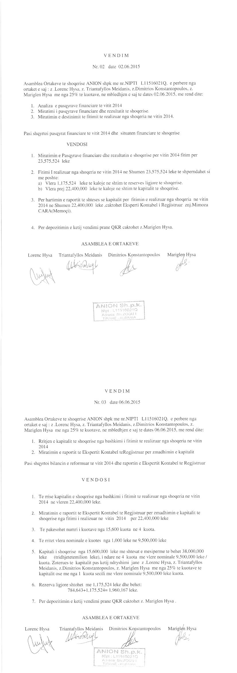 → Ekstrakt historik i regjistrit tregtar 15.02.2021 → Akti i themelimit → Kontrate shit-blerje kuotash 06.02.2012 → Vendimi i asamblese se ortakeve per zvogelimin e kapitalit 05.06.2019 → Vendimi per zmadhimin e kapitalit 02.06.2015 → Vendimi i asamblese per zmadhimin e kapitalit 27.05.2014 → Ekstrakti Historik i Regjistrit Tregtar date 02.05.2023 → Ekstrakti Historik i Regjistrit Tregtar date 11.08.2023 |