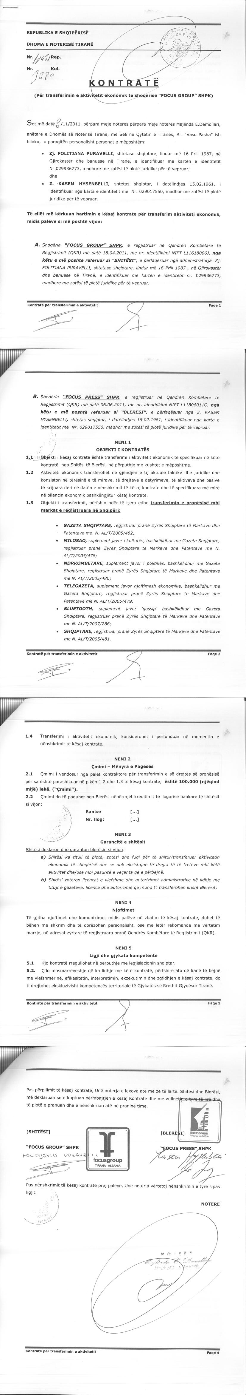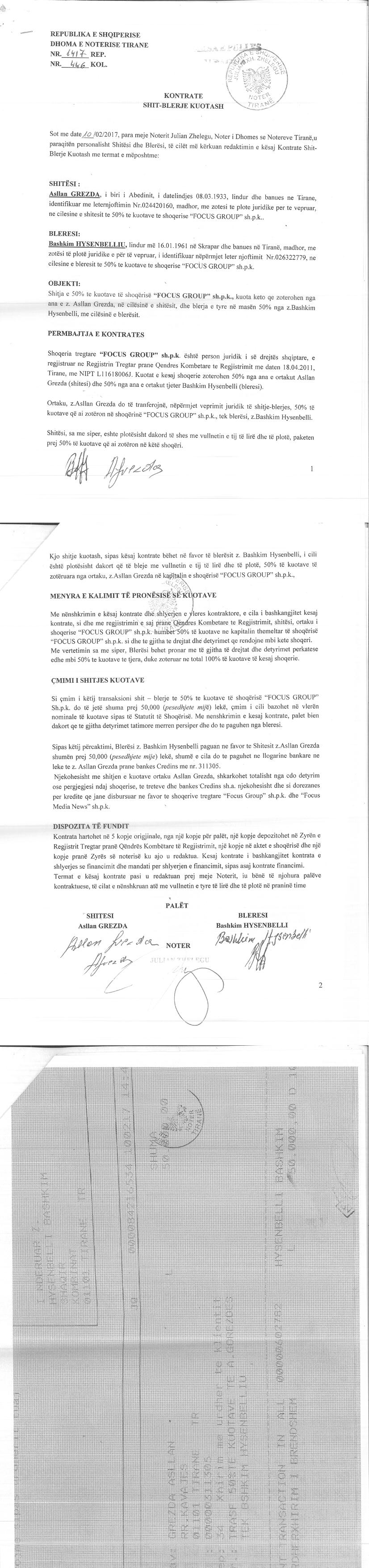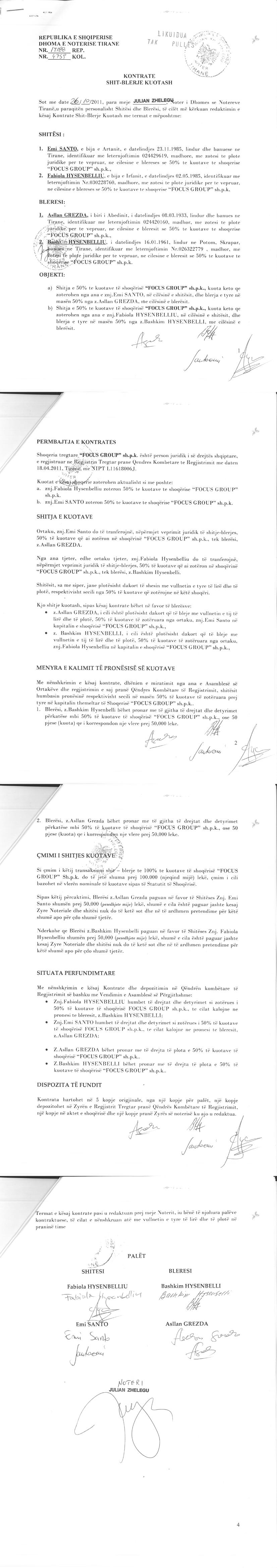 | Çështje Ligjore: | Shitja pjesore e aktivitetit Me date 08.11.2011, u nenshkrua kontrata ndermjet shoqerise “FOCUS GROUP” shpk dhe “Focus Press” shpk per shitjen e aktivitetit te "Focus Group" shpk si dhe te markave te regjistruara:"Gazeta Shqiptare", "Milosao", "Nderkombetare" "Telegazeta", "Bluetooth","Shqiptare".Cmimi total i shitjes se aktivitetit dhe markave te regjistruara do te jete 100.000 leke Marreveshje siguruese Ne daten 07.03.2017, me vendim te ortakut te vetem, u miratua krijimi i nje barre siguruese mbi 100 % te kuotave te shoqerise “FOCUS GROUP” Sh.p.k. si garanci per kontrate kredie afatgjate te akorduar nga “BANKA CREDINS” Sh.a. Ne daten 07.03.2017, u lidh marreveshja siguruese midis Z. Bashkim Hysenbelli (barredhenesi) dhe shoqerise “BANKA CREDINS” sh.a, (barremarresi), me objekt: Krijimi i nje barre siguruese mbi pasurite e luajtshme te barredhenesit, si garanci per kontrate kredie afatgjate te akorduar nga “BANKA CREDINS” sh.a, ne shumen totale 8.800.000 (tete milion e teteqind mije) euro. Ne daten 28.12.2018, u lidh marreveshja sigurues ndermjet Z. Irfan Hysenbelliu, shoqerise Focus Group dhe shoqerise “BANKA CREDINS” sh.a, me objekt krijimin e nje barre siguruese mbi pasurite e luajtshme te barredhenesit, si garanci per shlyerjen e kredise se akorduar nga Banka Credins ne baze te kontrates se kredise afatgjate te dates 28.12.2018. |