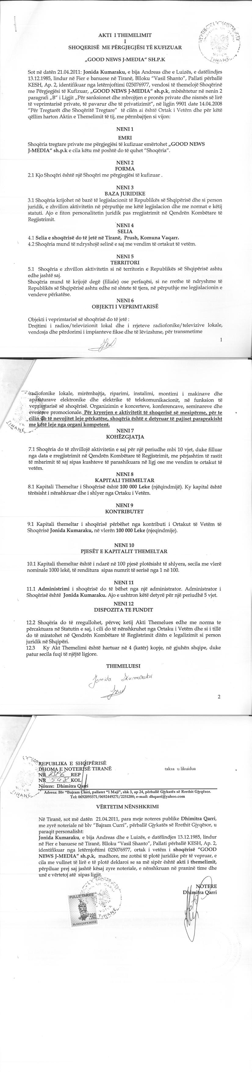 | Objekti i Veprimtarisë: | Drejtimi i radios/televizionit lokal dhe i rrjeteve radiofonike/televizive lokale, vendosja dhe perdorimi i impianteve fikse dhe te levizshme, per transmetime radiofonike dhe televizive lokale, mirembajtja, riparimi instalimi, montimi i makinave dhe aparaturave elektronike dhe elektrike te telekomunikacionit, ne funksion te veprimtarise se shoqerise. |