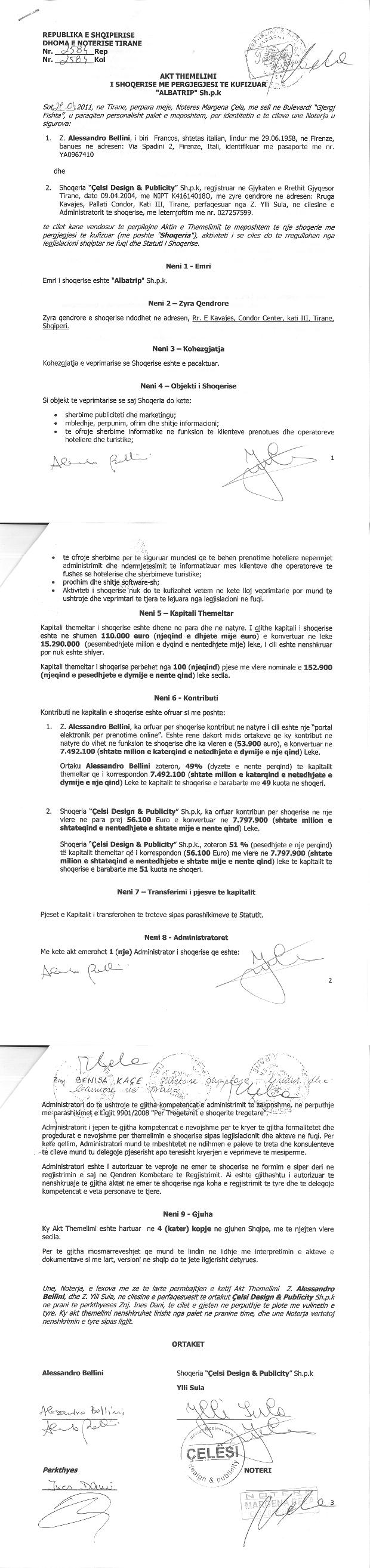 | Objekti i Veprimtarisë: | Sherbime publiciteti dhe marketingu, mbledhje , perpunim, ofrim, dhe shitje informacione, te ofroje sherbime informatike ne funksion te klienteve prenotues dhe operatoreve hoteliere dhe turistike, te ofroje sherbime per te siguruar mundesi qe te behen prenotime hoteliere nepernjet administrimit dhe ndermjetesimit te informatizuar mes klienteve dhe operatoreve te fushes se hotelerise dhe sherbimeve turistike, prodhim dhe shitje software-sh. Aktiviteti i shoqerise nuk do te kufizohet vetem ne kete lloj veprimtarie por mund te ushtroje dhe veprimtari te tjera te lejuara nga legjislacioni ne fuqi. Operator turistik i cili ben shitjen e produkteve te veta turistike, kryesisht, nepermjet agjencive te udhetimit, pa u kufizuar edhe me shitjen e drejteperdrejte te konsumatori. Operatori turistik nenshkruan kontrata te drejteperdrejta me furnizuesit e sherbimeve turistike, duke i parablere keto sherbime. "Agjencise se udhetimit" e cila ne menyre te drejtperdrejte ose si ndermjetes, merr persiper t'u ofroje turisteve dhe personave te tjere, si individe apo te organizuar ne grup, cdo lloj sherbimi udhetimi, perfshire akomodimin ne struktura pritese per turistet, keshillimin dhe ofrimin e sherbimeve te udhetimit me ajer, me toke e me det, te ekskursioneve te organizuara, si dhe nje sere sherbimesh te tjera ndihmese qe lidhen me industrine e turizmit. Si Agjenci e udhetimit shoqeria zhvillon veprimtarine e saj bazuar ne kontrata ndermjetesimi per shitjen e sherbimeve te ofruara nga furnizuesit e sherbimeve te udhetimit dhe/ose kontrata konsulence me konsumatorin. Shoqeria do te ofroje njekohesisht edhe asistencen e plote tekniko ligjore per pergatitjen, ndjekjen, perfaqesimin e paleve te treia me qellim marrjen e statusit "Investitor ne strukture akomoduese me 4 ose 5 Yje, statursspecial" per perfitimin e incetivave financiare qe derivojne nga perfitimi i ketij statusi. |