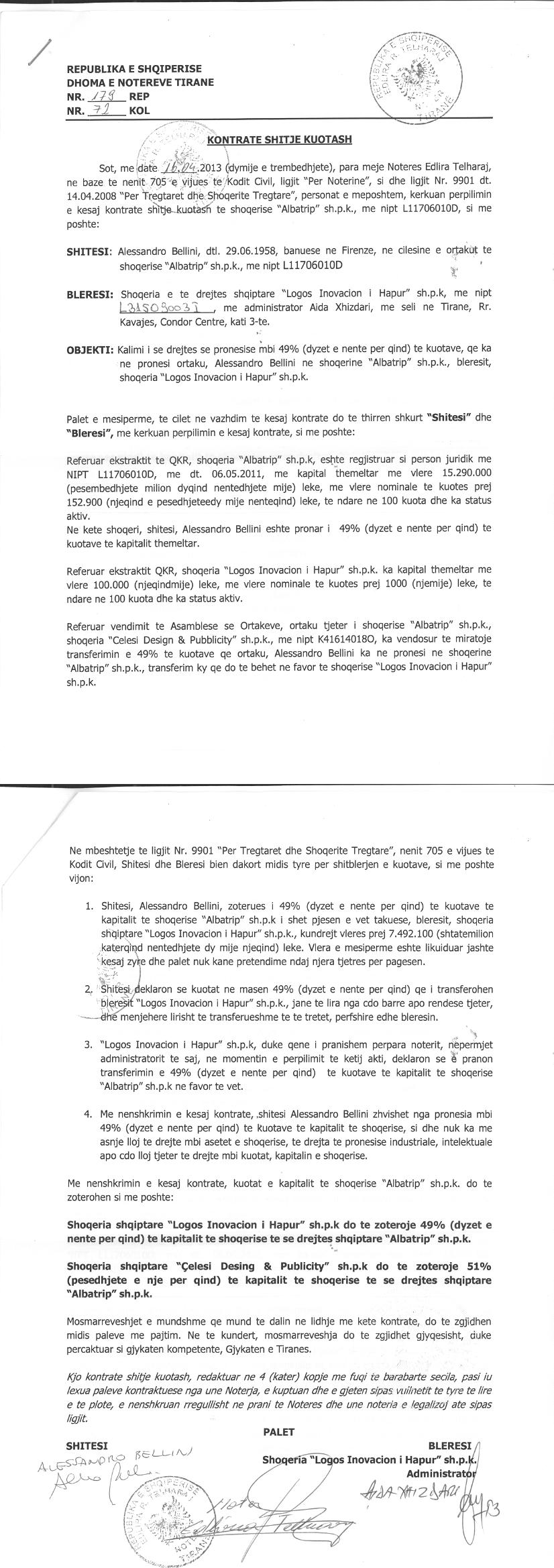 → Ekstrakt Historik i Regjistrit Tregtar date 21.02.2023 → Akt themelimi i Shoqerise → Kontrate Shitje Kuotash date 16.04.2013 → Kontrate Shitje Kuotash date 20.07.2015 → Kontrate Shitje Kuotash date 18.12.2018 → Kontrate Shitje Kuotash date 06.02.2019 → Kontrate Shitje Kuotash date 03.06.2021 → Ekstrakt Historik i Regjistrit Tregtar date 05.12.2024 |