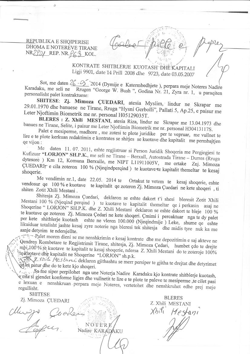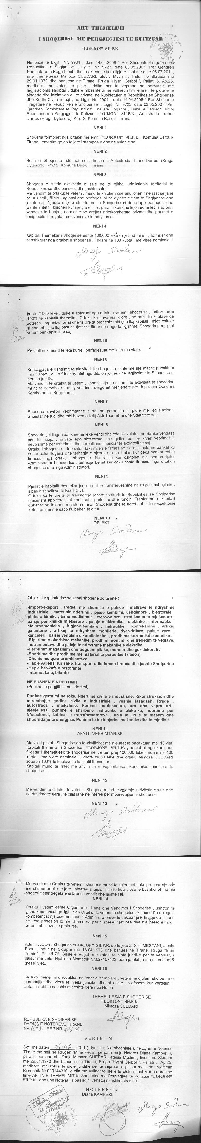 → Ekstrakt Historik i Regjistrit Tregtar date 02.03.2023 → Akt themelimi i Shoqerise → Kontrate Shitblerje Kuotash date 26.05.2014 → Projekt per Bashkimin me Perthithje te Shoqerive Tregtare "LORJON" SH.P.K (shoqeria e perthithur) me "DOPPLER-AL" SH.P.K (shoqeria perthithese) date 16.01.2023 |