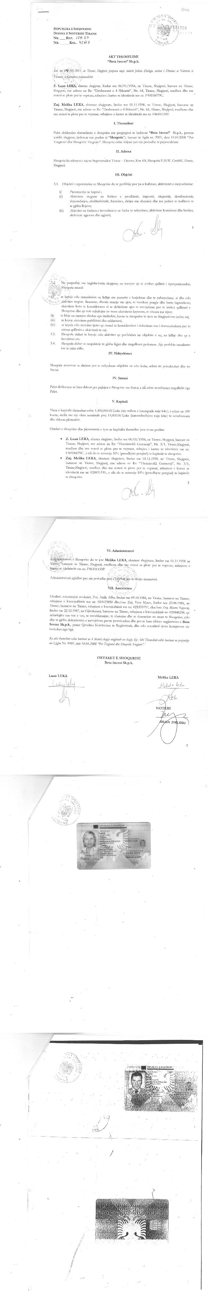 | Objekti i Veprimtarisë: | Pjesemarrja ne kapital, aktivitete tregtare ne fushen e prodhimit, importit , eksportit, distribucionit, shperndarjes, eskluzivitetit, francizes, shitjes me shumice e pakice te mallrave te te gjitha llojeve.Aktivitete ne fushen e investimeve ne fusha te ndryshme, aktivitete komisioni dhe broker dhe aktivitete agjensie dhe agjenti.Te kryej cdo transaksion me pasurit e luajtshme dhe te paluajtshme, si dhe cdo aktivitet tregtar financiar, dhenie marrje me qera dhe te vendos pengje dhe barre hipotekore.Te bleje ne menyre direkte ose indirekte kuota te shoqerive te tjera ne shqiperi ose jashte saj.Te kryej aktivitete publikimi dhe reklamimi. |