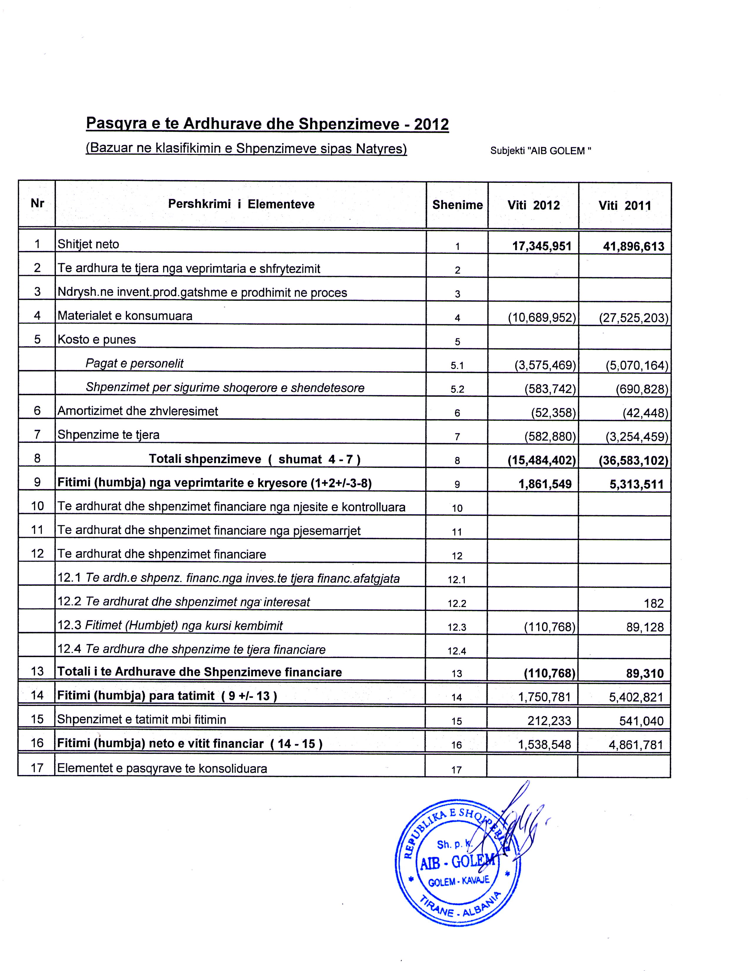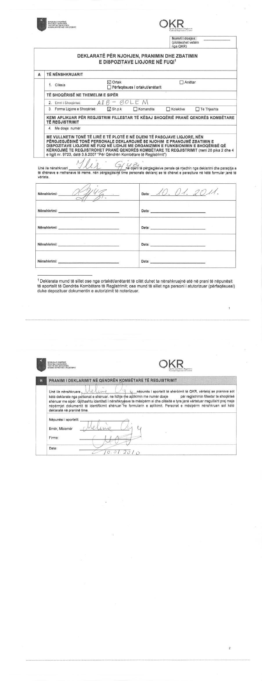 Statusi i shoqërisë ishte "Aktiv" u be "Pezulluar". II. Me datë 04.01.2012, me vendim të ortakut, u miratua Aktivizimi i aktivitetit. Statusi i shoqërisë ishte "Pezulluar" u be "Aktiv". III. Me datë 16.07.2013, me anë të urdherit Nr. 7755 Prot., Nr.Dosje 667, lëshuar nga Shoqeria Permbaruese Private “E.P.S.A” sh.p.k, u urdhërua: “Vendosja e sekuestros mbi kuotat e debitorit Z.Ilir Abdyl Gjuzi si dhe mbi te drejtat qe rrjedhin nga zoterimi i ketyre kuotave duke ndaluar tjetersimin ose disponimin e tyre si dhe ushtrimin e te drejtave qe rrjedhin nga keto kuota.” IV. Me datë 06.05.2015, me anë të Urdhrit nr. 3507 Prot., "Për Heqjen e Sekuestros konservative”, lëshuar nga Shoqëria Përmbarimore Private “E.P.S.A” shpk drejtuar QKR-së, u urdhërua: Heqja e sekuestros mbi kuotat dhe mbi te drejtat qe rrjedhin nga zoterimi i ketyre kuotave qe zoteron, debitori Ilir Gjuzi pranë subjekteve tregtare: shoqëria “AIB Golem” shpk, me NIPT L12510803P. |