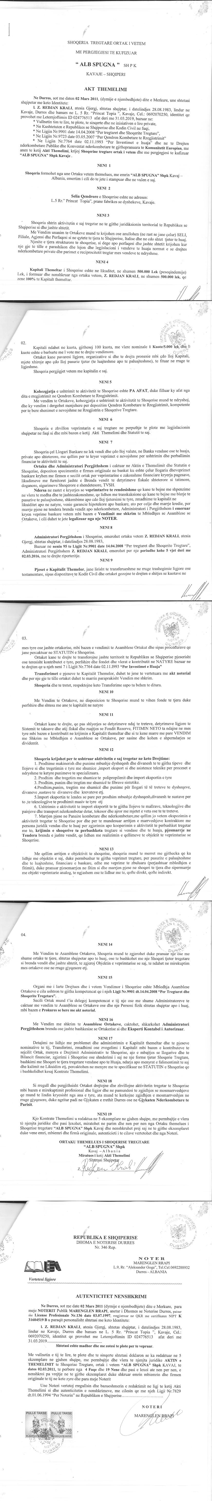 | Çështje Ligjore: | I. Me date 02/02/2016, me ane te Marreveshjes Siguruese Nr.1010 Rep., Nr. 329 Kol., date 29.12.2015, me objekt: Krijimi i nje barre siguruese mbi pasurite e luajtshme te barredhenesve, si garanci per kredine e akorduar nga Banka Credins. II. Me date 09/03/2016, me ane te Urdhrit Nr.3894-15 Regj. Nr.09898 Prot., date 29.02.2016 protokolluar nga Qkr me Nr.2337 Prot., date 07.03.2016, leshuar nga Shoqeria "Sherbimi Permbarimor Star" sh.p.k, u urdherua vendosja e sekuestros konservative ne kuotat/ aktivet e pales Redjan Krali ne Alb Spugna me Nipt-L12707803G. Aktivet dhe kuotat e mesiperme do te qendrojne te sekuestruara deri ne nje urdherese te dyte". III. Me date 29/03/2016, me ane te Urdhrit Nr.3894-15 Regj., Nr.13246 Prot., Prot, datë 17.03.2016, lëshuar nga Shoqëria “ Shërbimi Përmbarimor STAR”, u urdherua heqja e mases se sekuestros konservative, në aktivet/pasivet e pales Redjan Krali, ne subjektin “ALB SPUGNA” sh.p.k, me NUIS- (NIPT ) - L12707803G, te vendosur me ane te shkreses Nr.09898 Prot., datë 29.02.2016. IV. Me date 10/05/2021, me ane te Deklarates Noteriale Nr.1511 Rep., Nr.749 Kol., date 05.05.2021 leshuar nga "Banka Credins" SHA, e cila ka per qellim miratimin e kalimit te pronesise te 100% te kuotava me kushtin qe kuotat do te vazhdojne te bllokuara ne favor te bankes. |