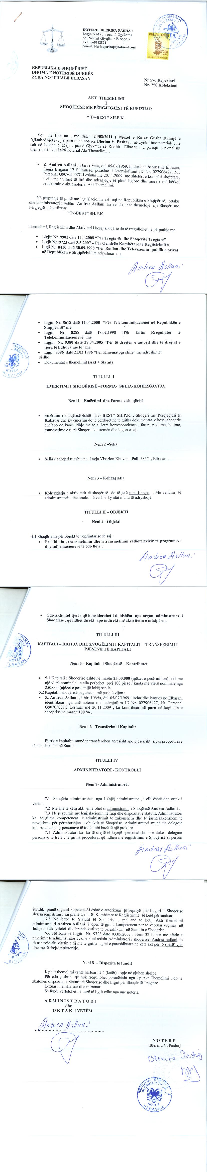 | Objekti i Veprimtarisë: | Prodhim, transmetimin dhe ritransmetimin radioteleviziv te programeve dhe informacioneve te cdo lloji. Cdo aktivitet tjeter qe konsiderohet i dobishem nga organi administrues i shoqerise, qe lidhet direkt apo indirekt me aktivitetin e mesiperm. Ritransmetim radio televiziv bazuar ne kabell koaksial dhe/ose fiber optike. Ritansmetim radio televiziv nepermjet internetit. Prodhim, blerje, shitje, marrje dhenie me hua te drejtash dhe veprash audio vizive me qellim informim dhe argetim per publikun e gjere per radio televizion. Ofrim i rrjeteve dhe sherbimeve te komunikimive elektronike dhe sherbimeve perkatese sipas legjislacionit ne fuqi. |