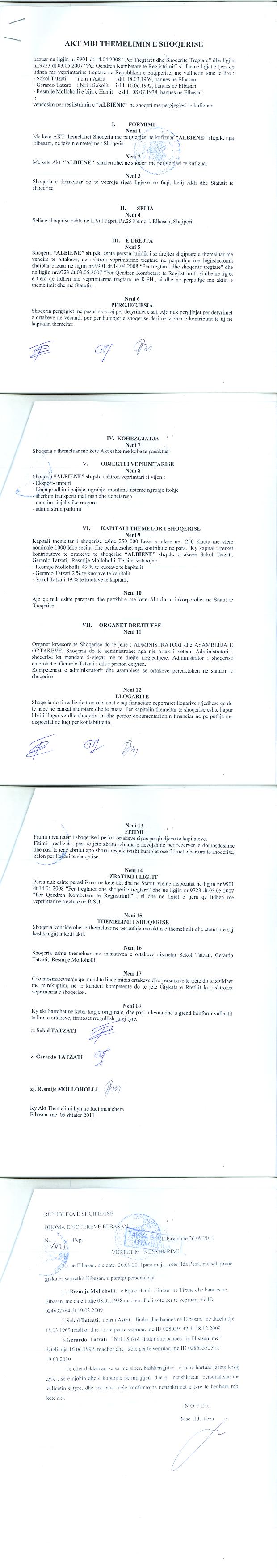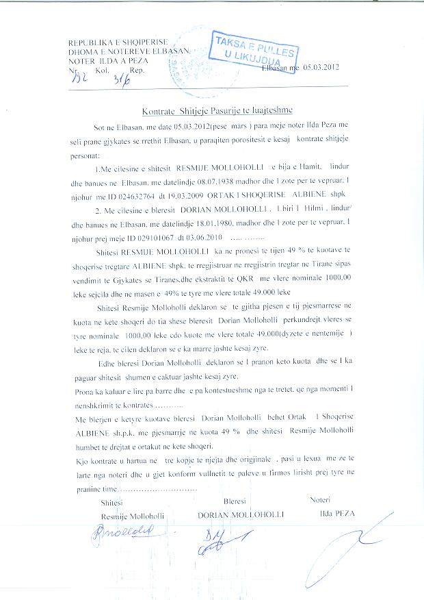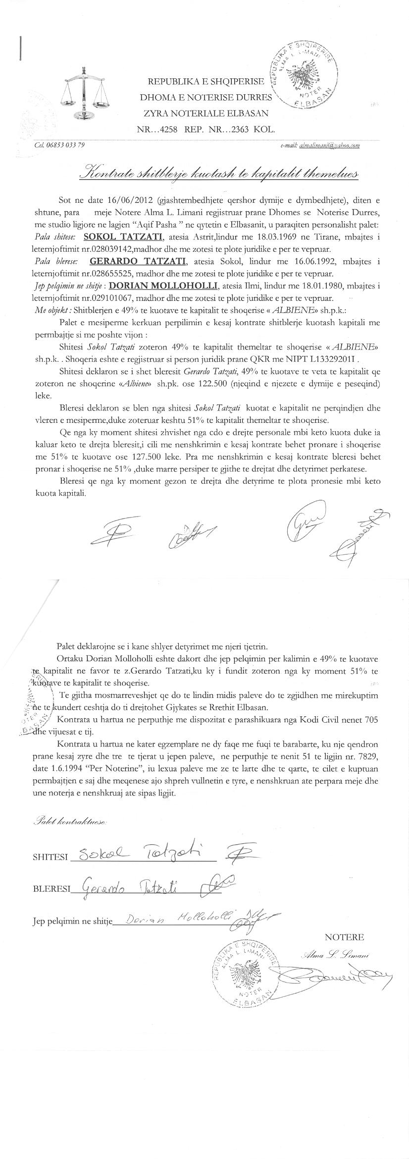 → Ekstrakt historik i regjistrit tregtar date 25.10.2021 → Akti i themelimit → Kontrate dhurimi date 05.03.2018 → Kontrate shitje kuotash date 27.06.2019 → Kontrate shitblerje kuotash date 16.06.2012 → Kontrate shitje pasurie te luajtshme date 05.03.2012 |