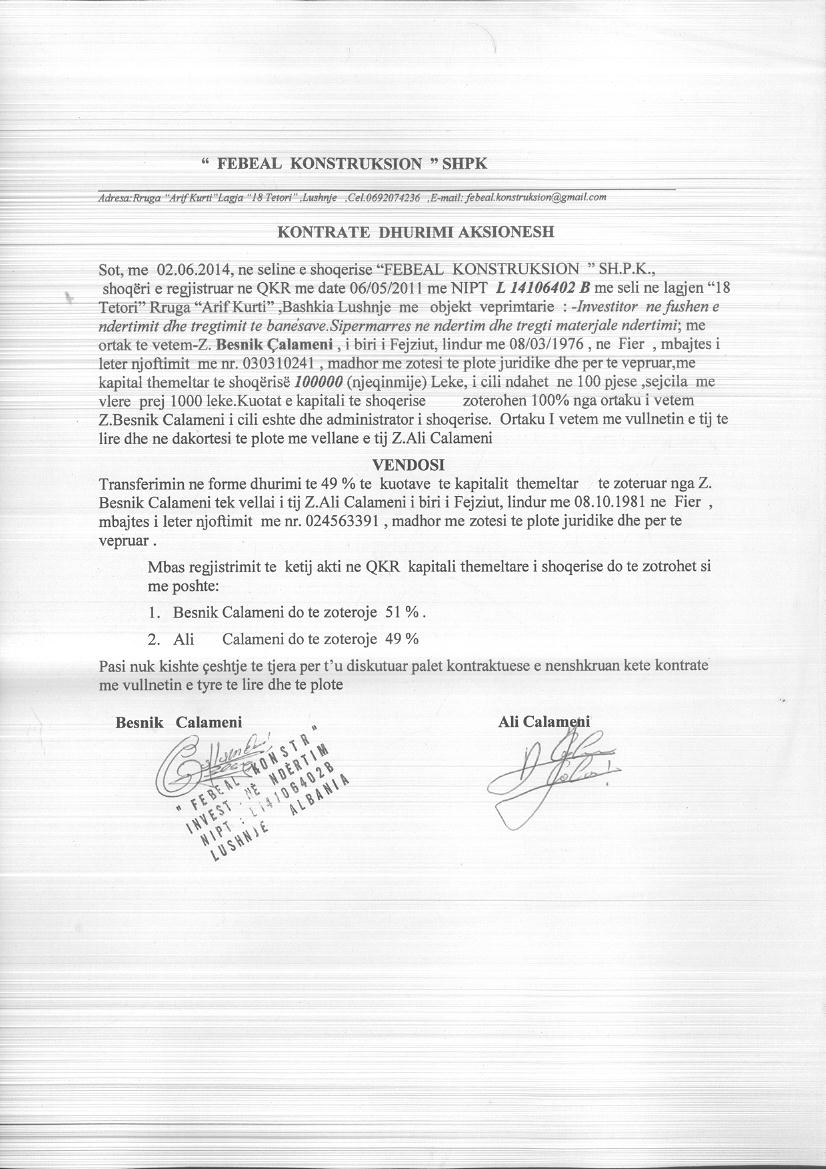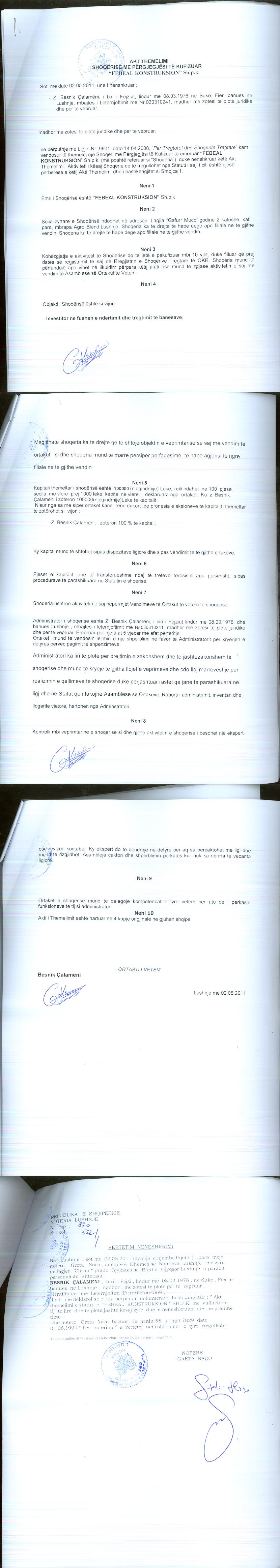 | Çështje Ligjore: | I. Me date 01/03/2018, me ane te Urdherit Nr. 209 Prot, date 23.02.2018 leshuar nga permbarues gjyqesor Z.Altin Vako, protokolluar nga QKB me Nr.2245 Prot., datë 26.02.2018, u urdherua vendosja e masës së sekuestros konservative mbi aksionet e shoqerise “FEBEAL KONSTRUKSION"shpk me NIPT-L4106402B dhe Besnik Çalamëni. II. Me date 13/03/2018, me ane te Vendimit Nr.234 Prot., Nr.1032 Dosje datë 28.02.2018, protokolluar nga QKB me Nr.2411 Prot., date 01.03.2018 lëshuar nga Permbarues Gjyqesor Privat Altin Vako, drejtuar QKB-se, u urdherua zhbllokimi i aksioneve apo kredive te subjektit “Febeal Konstruksion” sh.p.k., me NUIS-L14106402B dhe Z.Besnik Çalameni ,te bllokuara me ane te shkreses Nr. 209 Prot, date 23.02.2018 te Permbaruesit Gjyqesor Altin Vako. III. Me date 07/04/2022, depotimi i licences se kompanise me nr.lic NZ6621/4. IV. Me date 09/09/2022, depozitimi i vendimit, date 02.09.2022 per depozitimin e Liçences MK. 3999 dhe Liçences N.7132. |