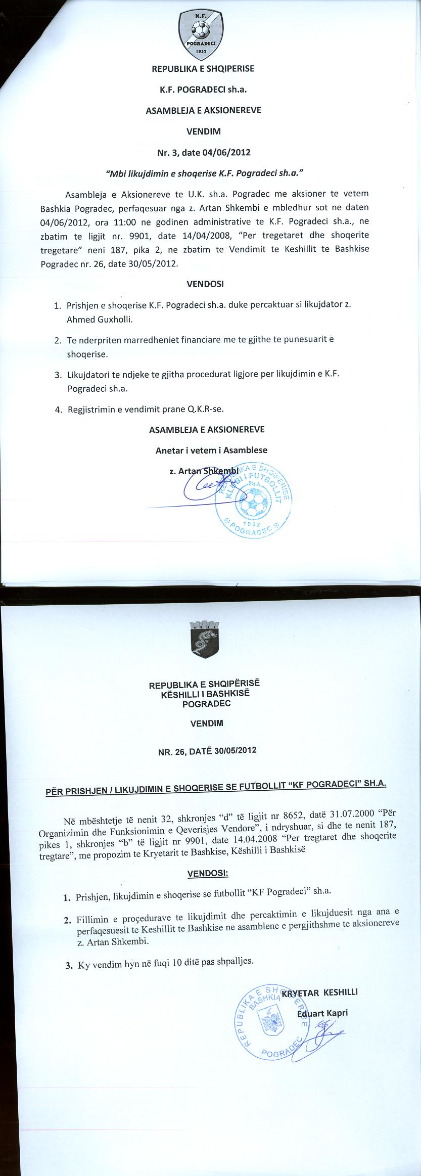 | Çështje Ligjore: | I. Me date 28.05.2012, me kerkese te administratorit te shoqerise, u kerkua: Pushim i Perkohshem i Aktivitetit. Statusi i Shoqerise kalon nga "Aktiv" ne "Pezulluar" II. Me date 30.05.2012, me ane te vendimit nr.26, te Keshillit te Bashkise Pogradec “Per Prishjen/ Likuidimin e shoqerise “K.F.Pogradeci sh.a”, u vendos: 1.Prishja, likudimi i shoqerise se futbollit “K.F.Pogradeci sh.a”. 2.Fillimin e proçedurave te likuidimit dhe percaktimin e likuiduesit nga ana e perfaqesuesit te Keshillit te Bashkise ne asamblene e pergjithshme te aksionereve z.Artan Shkembi. III. Me date 04.06.2012 , me ane te vendimit nr.3, te asamblese se aksionereve te shoqerise “K.F.Pogradeci” sh.a, “Mbi Likuidimin e shoqerise“K.F.Pogradeci” sh.a, u vendos: 1.Prishja e shoqerise “K.F.Pogradeci” sh.a duke percaktuar si likuidator z.Ahmed Guxholli. 2.Likuidatori te ndjeke te gjitha proçedurat ligjore per likuidimin e K.F.Pogradeci sh.a. Statusi i Shoqerise kalon nga "Pezulluar" ne "Shoqeri ne Likuidim e Siper" |