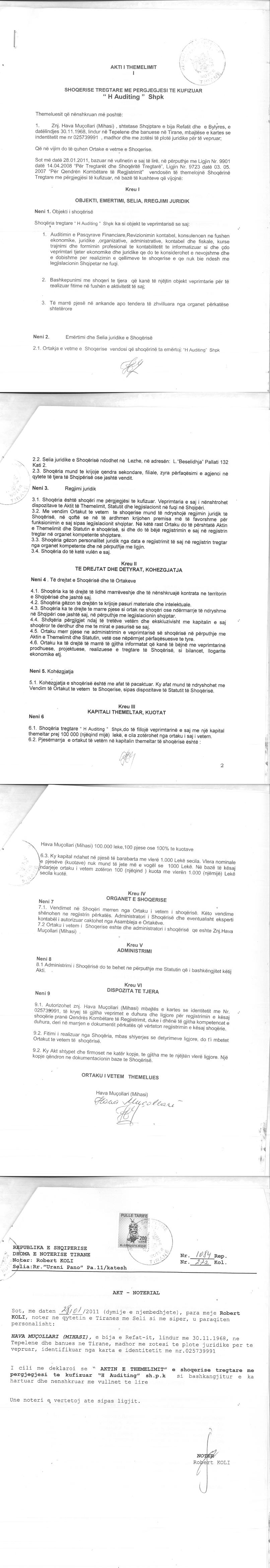 | Çështje Ligjore: | I. Me date 06/07/2022, me ane te Urdherit Nr.463/7 0058-22 Prot., date 01.07.2022, leshuar nga Përmbarues Gjyqesor Privat “Kodra Bailiff Service” shpk, u urdherua vendosja e masës së sekuestros konservative mbi aksionet/kuotat e debitorit; Shoqeria “H Auditing” SHPK me NIPT- L17608503A, si dhe mbi te drejtat qe rrjedhin nga zoterimi i ketyre kuotave/aksioneve duke ndaluar tjetersimin dhe/ose disponimin e tyre. Kuotat/aksionet do te qendrojne te sekuestruara deri ne nje urdherese te dyte nga ana e jone. II. Me date 27/07/2022, me ane te Urdherit Nr.463/12 0058-22 Prot., date 15.07.2022, leshuar nga Përmbarues Gjyqesor Privat “Kodra Bailiff Service” shpk, u urdherua heqja e masës së sekuestros konservative mbi kuotat/aksionet e debitorit; Shoqeria “H Auditing” SHPK me NIPT- L17608503A, si dhe mbi te drejtat qe rrjedhin nga zoterimi i ketyre kuotave/aksioneve . |