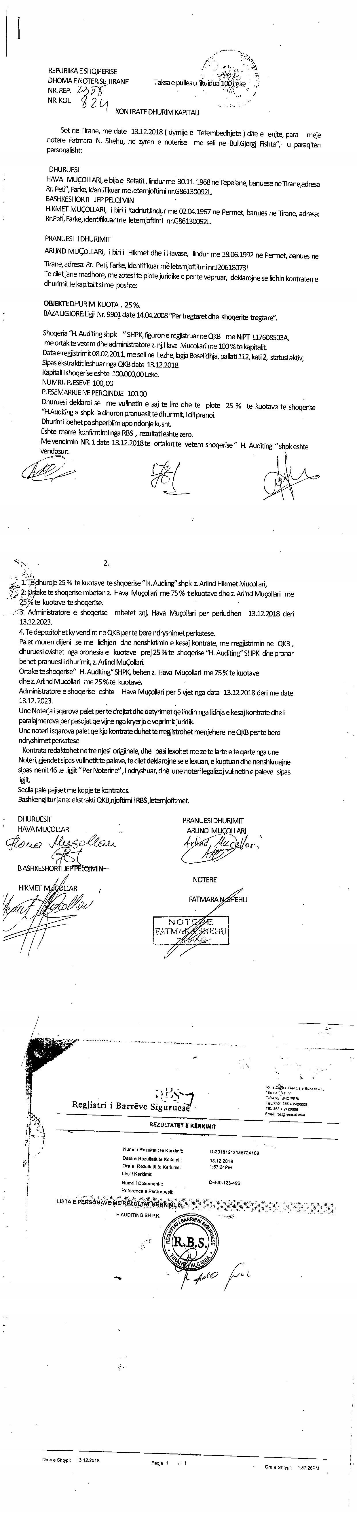 → Ekstrakt Historik i Regjistrit Tregtar date 06.03.2023 → Akt themelimi i Shoqerise → Kontrate Dhurimi Kuotash date 13.12.2018 → Urdher per Venie Sekuestro date 01.07.2022 → Urdher per Heqje Sekuestro date 15.07.2022 |