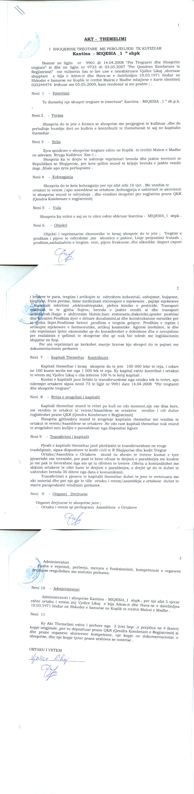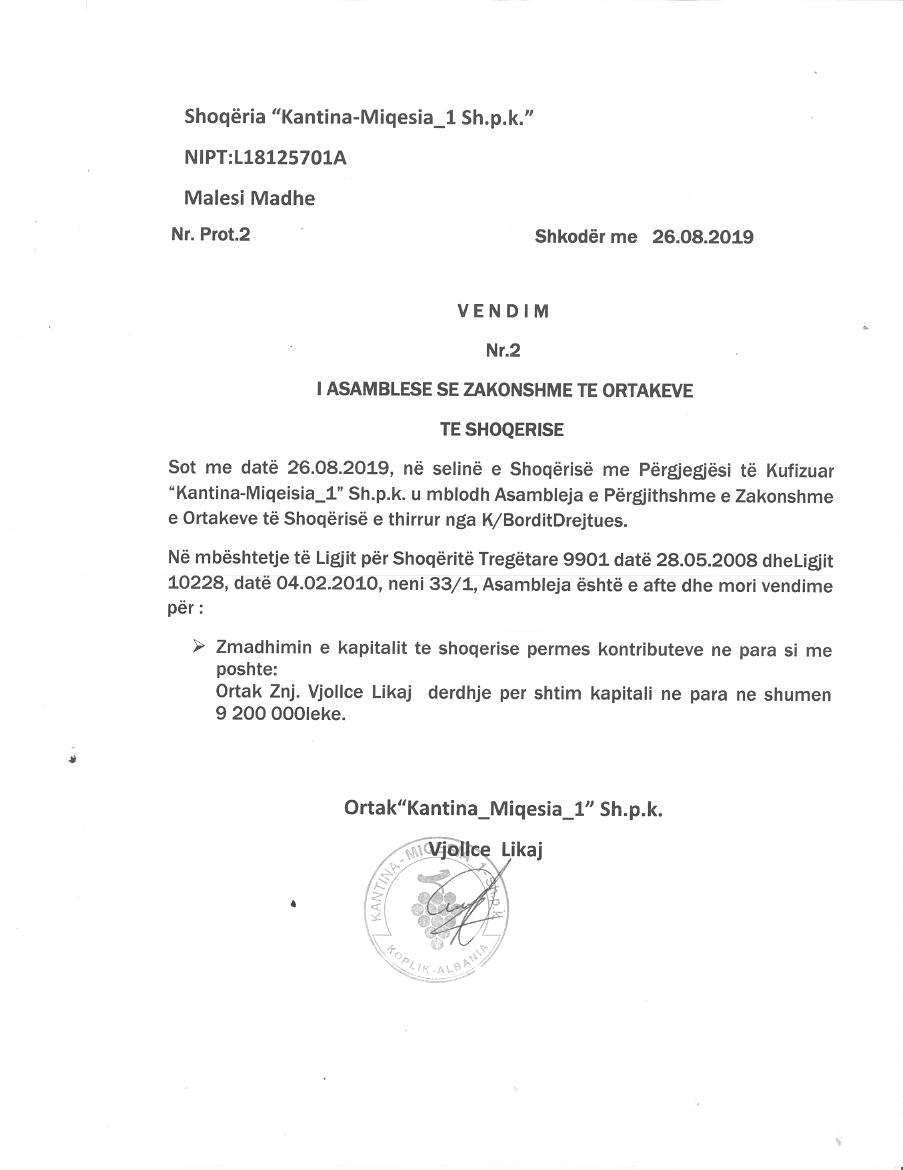→ Ekstrakt Historik i Regjistrit Tregtar date 13.09.2025 → Akt themelimi i Shoqerise → Vendim i Asamblesë së Ortakëve për Zmadhimin e Kapitalit datë 26.08.2019 |