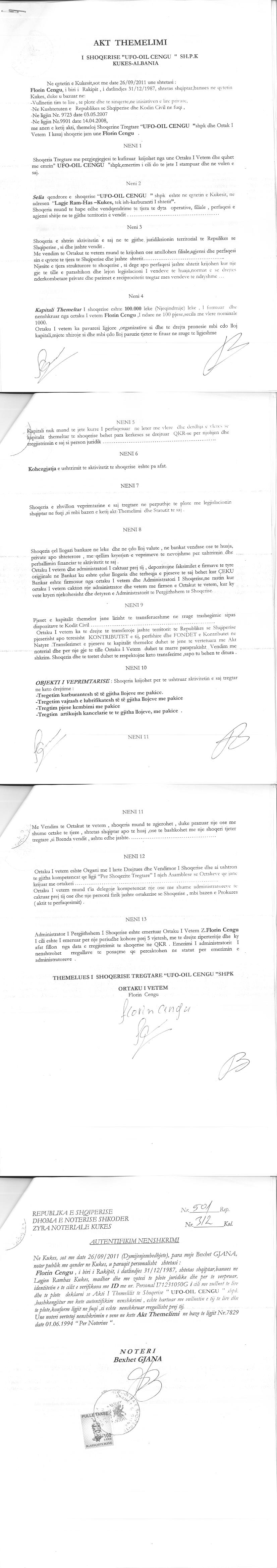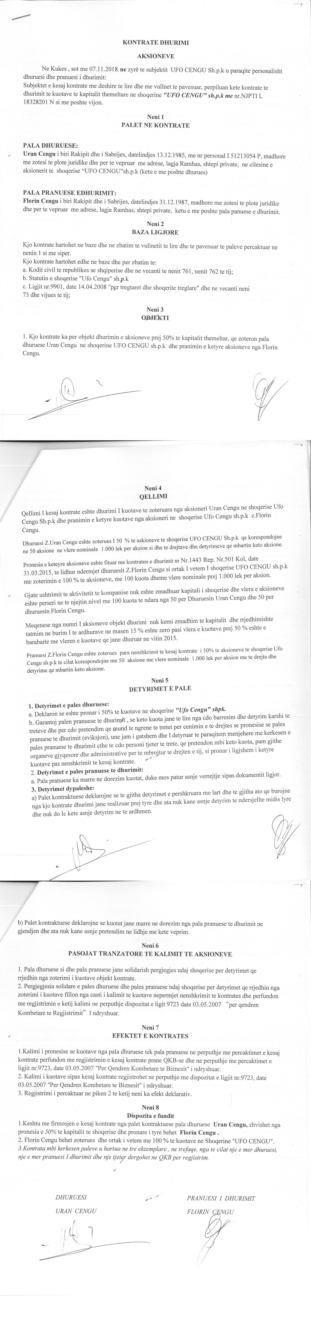 → Ekstrakt Historik i Regjistrit Tregtar date 20.02.2023 → Akt themelimi i Shoqerise → Vendim i Ortakut te Vetem, Dhurim Kuotash date 31.03.2015 → Kontrate Dhurimi Kuotash date 07.11.2018 |