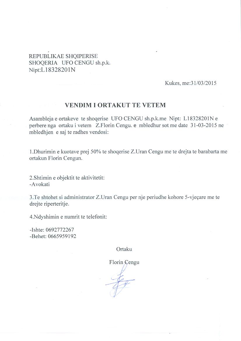 | Çështje Ligjore: | I. Me date 12.10.2011, me vendim te ortakut te vetem, u vendos: Pushim i Perkohshem i Aktivitetit. Statusi i Shoqerise kalon nga "Aktiv" ne "Pezulluar" II. Me date 12.01.2012, me vendim te ortakut te vetem, u vendos: Aktivizim i Aktivitetit. Statusi i Shoqerise kalon nga "Pezulluar" ne "Aktiv" III. Me date 18/10/2017, me ane te Vendimit date 02.10.2017 , u percaktua Celja e llogarive bankare ne monedhen vendase apo te huaj ne bankat e nivelit te dyte, brenda dhe jashte territorit te Republikes se Shqiperise, dhe kryerjen e veprimeve financiare nepermjet administratorit te shoqerise. |