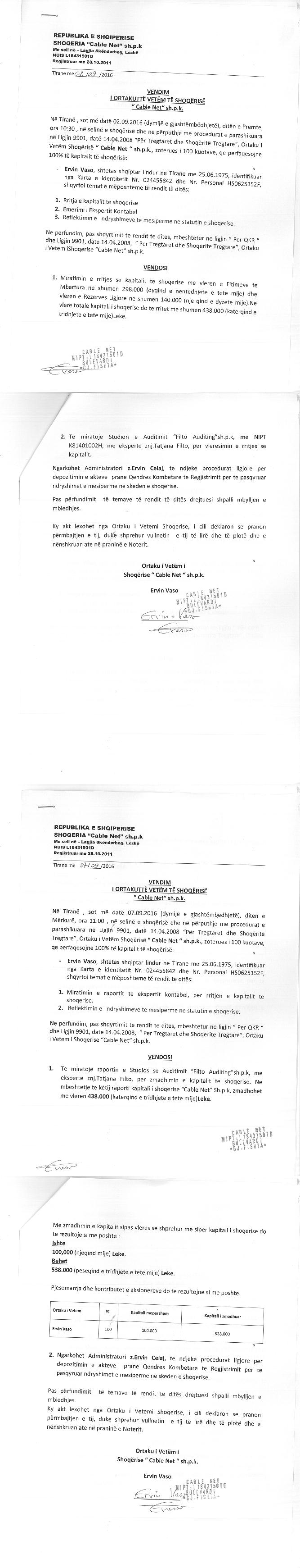 → Ekstrakti Historik i Regjistrit Tregtar date 16.08.2022 → Akt themelimi i Shoqerise → Kontrate Shitje Kuotash date 16.04.2014 → Kontrate Shitje Kuotash date 06.05.2015 → Kontrate Shitje Kuotash date 02.07.2015 → Vendim i Ortakut te Vetem, Zmadhim Kapitali date 07.09.2016 |