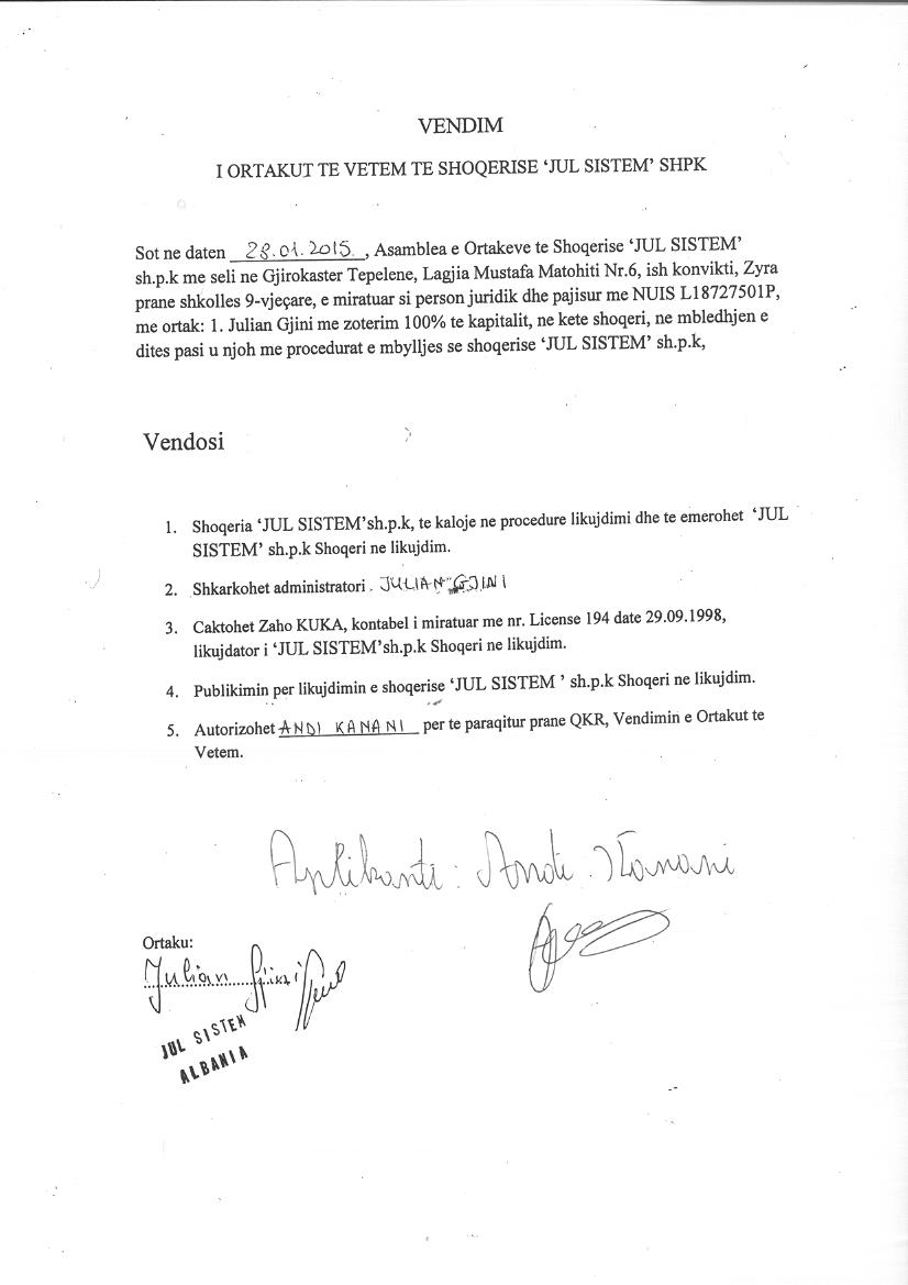 → Ekstrakt Historik i Regjistrit Tregtar date 25.10.2024 → Akt themelimi i Shoqerise → Vendim i Ortakut të Vetëm për Likuidimin e Shoqërisë datë 28.01.2015 |