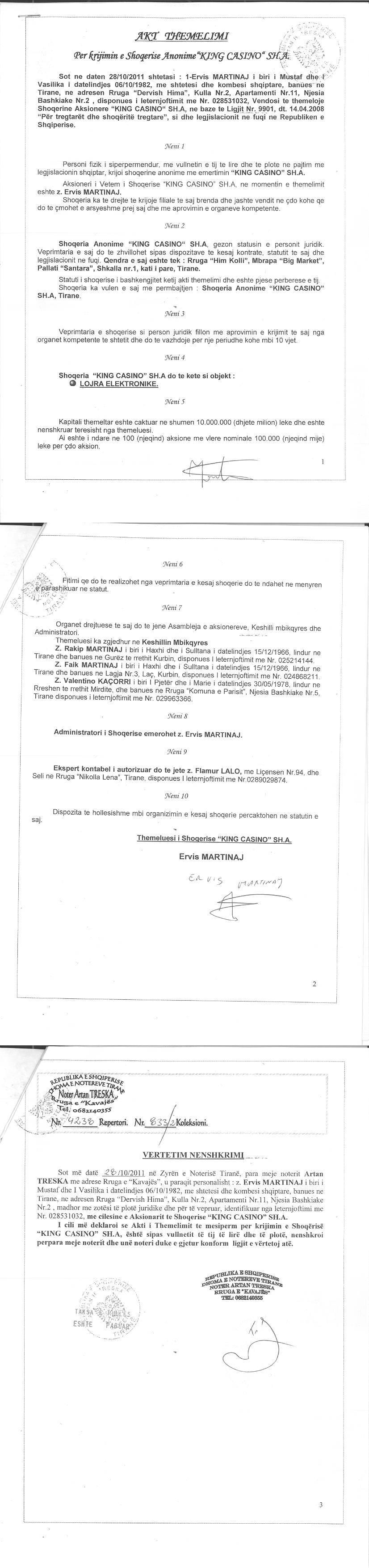| Çështje Ligjore: | I. Me date 20.05.2015, me vendim te aksionerit te vetem, u vendos : Pushim i Perkohshem i Aktivitetit. Statusi i Shoqerise kalon nga "Aktiv" ne "Pezulluar" II. Me datë 31.01.2023, me anë të shkreses nr. 240/4 Prot, nga Drejtoria e Pergjithshme e Policise se Shtetit per njohje dhe ekzekutim te Vendimit Nr. 5, date 23.01.2023 te Gjykates se Posacme te shkalles se pare per Korrupsionin dhe Krimin e Organizuar u vendos; Sekuestrimi i pasurive te shtetasit Ervis Martinaj dhe personave te lidhur me te. Depozitim i Urdherit te Prokurorit date 27.01.2023 per ekzekutimin e Vendimit Nr. 5, date 23.01.2023 per sekuestrimin e pasurive. |