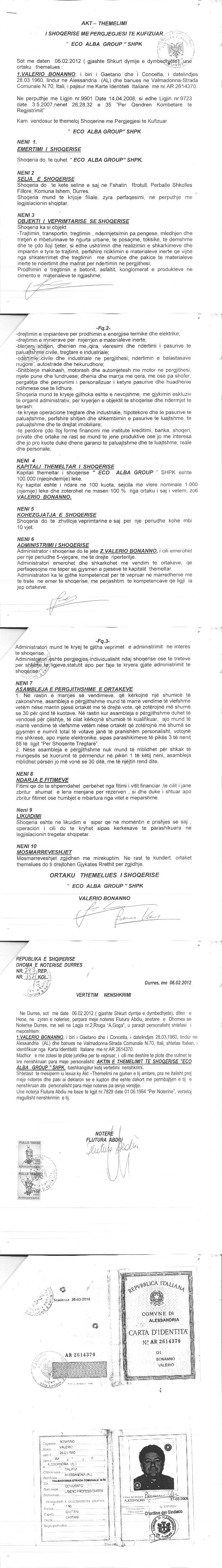 | Objekti i Veprimtarisë: | Trajtimin, transportin, tregtimin, ndërmjetsimin pa pengesë, mbledhjen dhe tretjen e mbeturinave të ngurta urbane, të posaçme, toksike, të dëmshme dhe të çdo lloji tjetër, si edhe ushtrimin dhe realizimin e shkarkimeve dhe impiantin e tyre të trajtimit, përfshirë riciklimin e materialeve inerte të ndërtimit dhe mallrat për ndërtimin në përgjithësi: Prodhimin e tregtimin e betonit, asfaltit, konglomerat e produkteve në çimento e materialeve të ngjashme: drejtimin e impianteve për prodhimin e energjisë termike dhe elektrike, drejtimin e minierave për nxjerrjen e materialeve inerte, blerjen, shitjen, dhënien me qera, vlerësimi dhe ndërtimi i pasurive të paluajtëshme civile, tregtare e industriale, ndërtime civile dhe industriale në përgjithësi, ndërtimin e balastasave rrugore, autostradë dhe hekurudhore. Shitblerje makinash, motorash dhe automjetesh me motor në përgjithësi, mjete pune dhe lundruese etj. Zyrë konsulencë juridike (avokatie). |