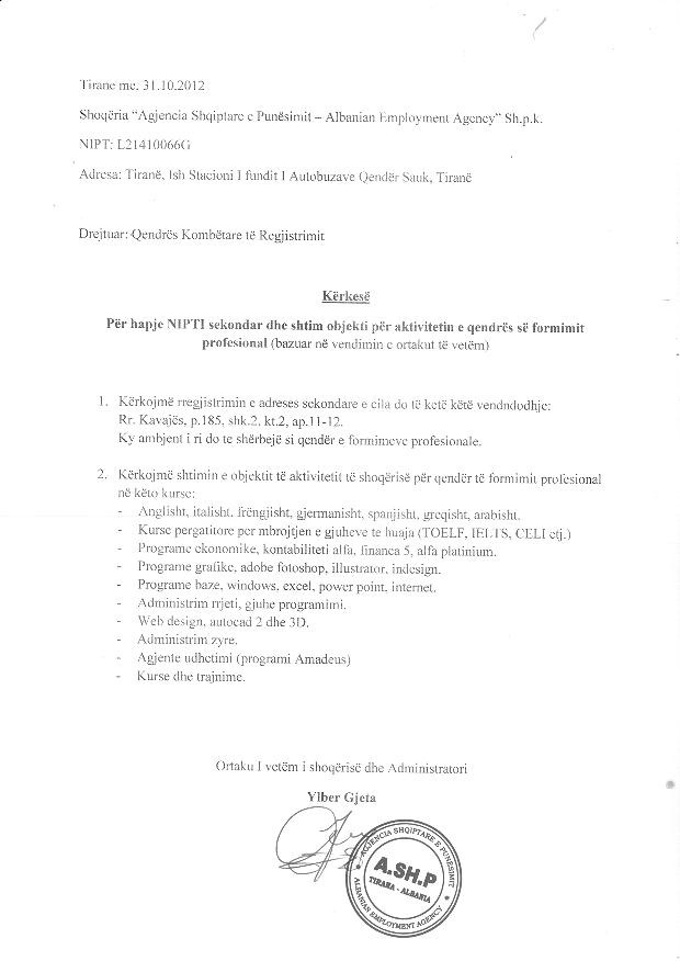 | Objekti i Veprimtarisë: | Ndermjetesim punesimi brenda dhe jashte vendit,ndermjetesim shkollimi brenda dhe jashte vendit, trajnime te ndryshme.Hapjen e qendrave te formimit profesional ne keto kurse:anglisht, italisht,frengjisht, gjermanisht, spanjisht, greqis ht,arabisht.Kurse pergatitore per mbrojtjen e gjuheve te huaja (TOELF,IELTS,CELI etj).Programe ekonomike,kontabiliteti alfa,financa 5, alfa platinium. Programe grafike,adobe fotoshop, illustrator , indesing.Programe baze, windows, excel,power point,internet.Administrim rrjeti,gjuhe programimi.Web desing,autocad 2 dhe 3D.Administrim zyre.Agjente udhetimi (programi Amadeus).Kurse dhe trajnime.Veprimtari trajnuese te punonjesve arsimore te institucioneve arsimore. Veprimtari trajnuese per profesionet e rregulluara. Vleresime te jashtme per institucionet e arsimit parashkollor, 9-vjecar, parauniversitar, universitar dhe pasuniversitar. Akreditime te programeve shkollore, universitare dhe pasuniversitare. Veprimtari brokerimi, ndermjetesimi ne sigurime. Ndermjetesim ne zgjidhjen e konflikteve. Konsulence dhe asistence ligjore dhe ekonomike. Audit i jashtem dhe audit 2 ligjor. Ndermjetesim ne tregun e pasurive te paluajteshme, imobiliare. Perkthime Konsulenca psikologjike. Call center. Bar-kafe. Elektricist, hidraulik, automekanik/elektroauto, kuzhinier, punime dekorative gips dhe lyerje, punime dekorative guri, teknik ndertimi, murator dhe suvatues, saldator, picajol, prodhime brumi, furretar, montim dhe riparim sistem gazi (instalator gazi), hidrokarbure ,marangoz, rrobaqepesi ,qendistari, babysitter (kujdestar\e per femije.) kujdestar\e per te moshuar, elektroshtepiake,teknik cellular, njohja me lendet e rrezikshme dhe transportimi i tyre, bojaxhi, punime duroalumin, banakier, kamarier, parkete druri, laminat, sekretari administrim zyre, sistem ngrohje ftohje, montim dhe riparim kondicioner, fizioterapi, kurse piano,dj(deejay), montim dhe riparim kaldaje teknologji informacioni( IT) bota laboratorike dhe njohja me paisjet e saj, riparim kompjuterash, riparim tv, riparim sobe, riparim lavatrice, menaxhim biznesi, riparim frigorifer, recepsionist, hoteleri-turizem, fizike,matematike, bio-kimi, gjuhe-letersi, punim dhe shtrim pllakash, montim dhe riparim dyer, dritare, parkete, kurs per shitje karburanti, kasap, orendreqes, kepucar, parukeri dhe estetike, berber, kujdestar per personat me aftesi te kufizuar, kujdestar shtepie, sanitare, zjarrfikes, shef kuzhine, krye kamarier, shites ne dyqan, shites te paisjeve elektronike, arketar, agjent marketinr, fermer, kopshtar, montim dhe mirembajtje sere, rritje dhe mirembajtje kuajsh, rritje dhe mirembajtje shpendesh, rritje dhe mirembajtje bletesh, gjahtar, kultivim dhe rritje peshku, betonues dhe karpentier ndertues çatish, fonditor dhe pergatites te formave(metal) llamarinist, lyerje makinash, pergatites te konstruksioneve metalike, montues te çelikeve dhe kabllove metalik, farketar dhe kovac, montues dhe mirmbajtes te makinerive metalprerese, frezator lemues te instrumenteve. Projektim, ndertim, zbatim pallatesh deri ne 20 (njezet) kate, vilash, objekte kulti etj. Rikonstruksione objektesh pallate deri ne 20 (njezet ) kate, vila, shkolla, kopeshte, cerdhe, objekte kulti etj. Sherbime dhe mirembajtje objektesh. Kurse profesionale per pajisjet nenpresion (ajer, azot, oksigjen, CH4, GLN). 1- Kurs Kuzhinier.2- Kurs Banakier.3- Kurs Kamarier.4- Kurs Parukier.5- Kurs Estetik 6- Kurs Berber.7- Kurs Picajol.8- Menaxhim Turizmi.9- Kurs Kasap 10-Kurs Furrtar 11-Kurs Saldator 12- Kurs Marangoz 13-Pasticier.14- Siguria ne Kantier.15- Manovrator per mjete te renda.16- Rrobaqepesi.17- Elektroshtepiake.18- Siguria dhe shendeti ne Pune. 19- Punime dekorative guri. Eksport – import. Shitje me shumice e pakice te mallrave te ndryshem ndustrial dhe ushqimore si : detergjente, kancelari , materiale per mirembajtjen e zyrave.rrjetet hidraulike, elektropompa, paisje kompjuterike.kaldaja, kondicioner.sisteme ngrohje ftohke si dhe mirembajtjen e tyre, te te gjitha llojeve te pjeseve te kembimit, e reja dhe te perdorura per automjete te transportit tokesor, detar, ajror. Hapjen dhe shfytezimin e serviseve per riparim dhe mirembajtje. Pastrimi i kanaleve te ujrave te bardha e te zeza;pastrami i puseve te uj it. Trajnimi i kursanteve per manjen e patentes per drejtim mjeti te gjitha kategorive.Tregtim me shumice dhe pakice te materialeve te ndertimit, elektrike, hidraulike, vegla pune. detergjenteve, kimikateve, luleve, pemeve, farave, profileve metalike te cdo lioji. bojera te te gjithe llojeve. Punime druri (marangoz), punime duralumini, tregti me shumice dhe pakice te materialeve per keto punime . Punime te ndryshme me mjete te renda me zinxhir dhe pa to.Punime te te gjithe llojeve ne fushen e ndertimit, pastrim te territoreve, kanaleve, gropave septike. Tonera per printera, printime. Hapjen dhe shfytezimin e serviseve per riparim dhe mirembajtje. Pastrimi i kanaleve te ujrave te bardha e te zeza;pastrami i puseve te ujit. Hedhje te dhenash ne sistem per qendrat shendetsore dhe jo vetem, database per institucione te ndryshme. Konsulenc juridike per ente publike dhe subjekte private etj. Sherbime pastrimi, mirembajtje, disifektimi ambientesh. Çertifikim ne panele Sandëiche etj. |