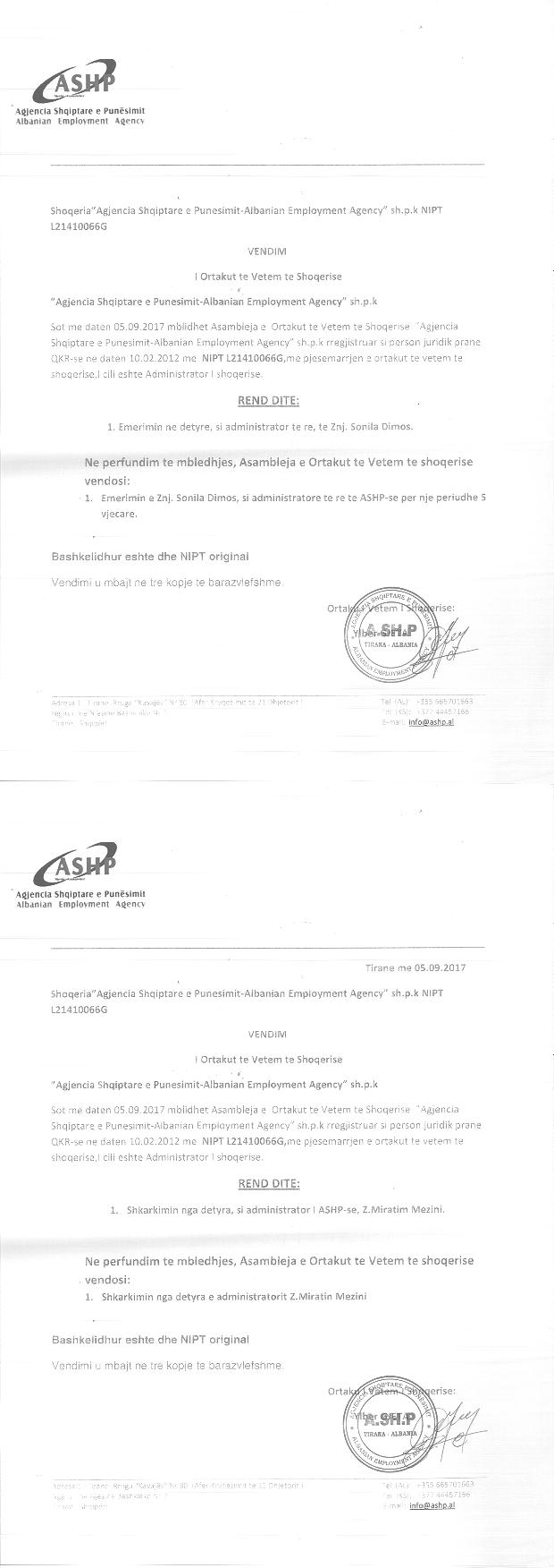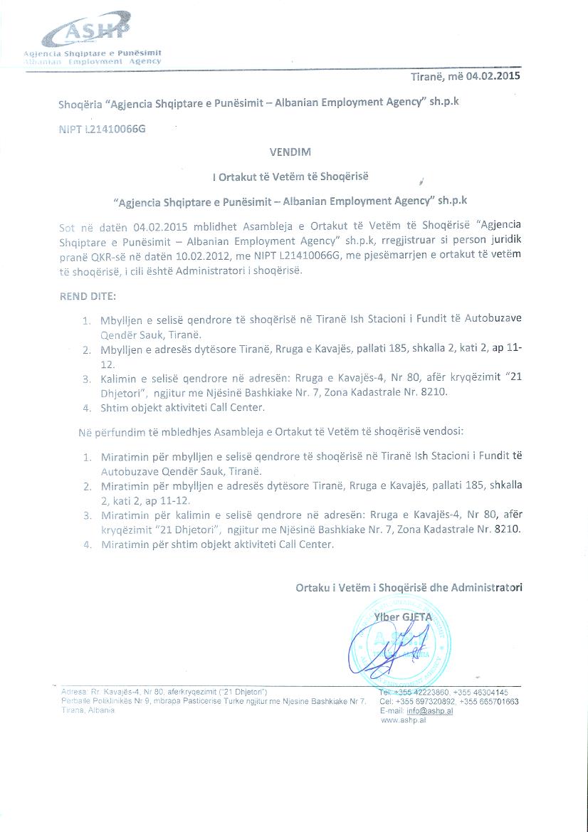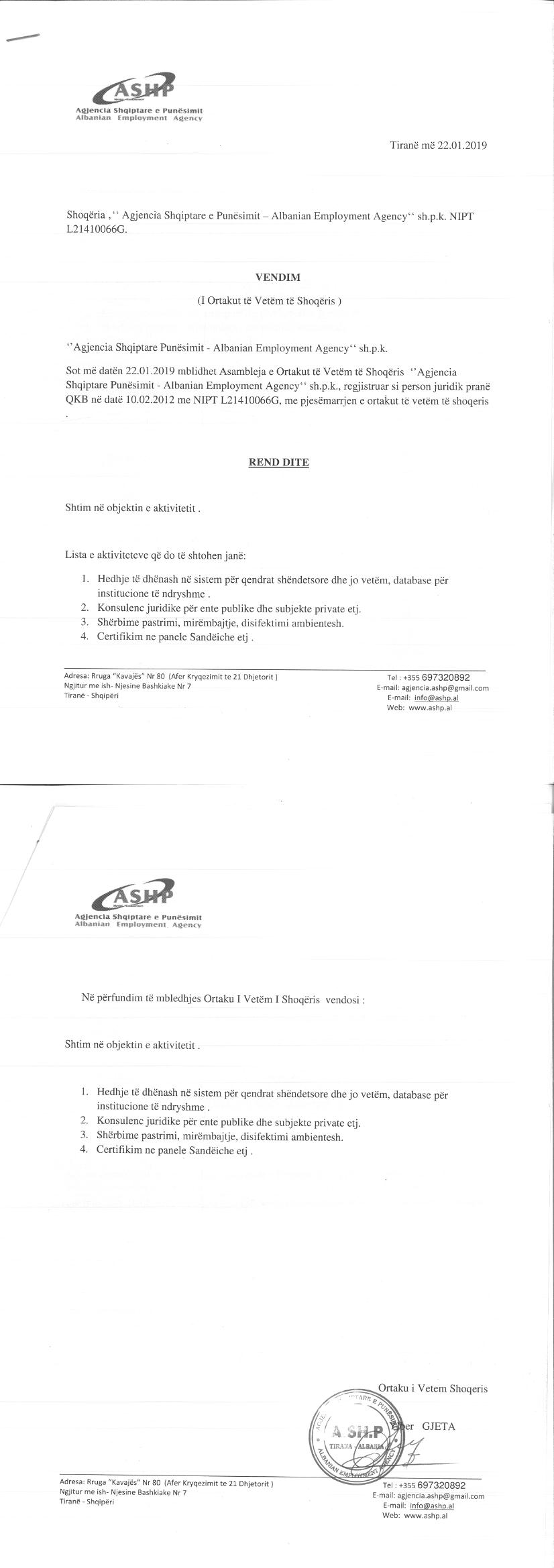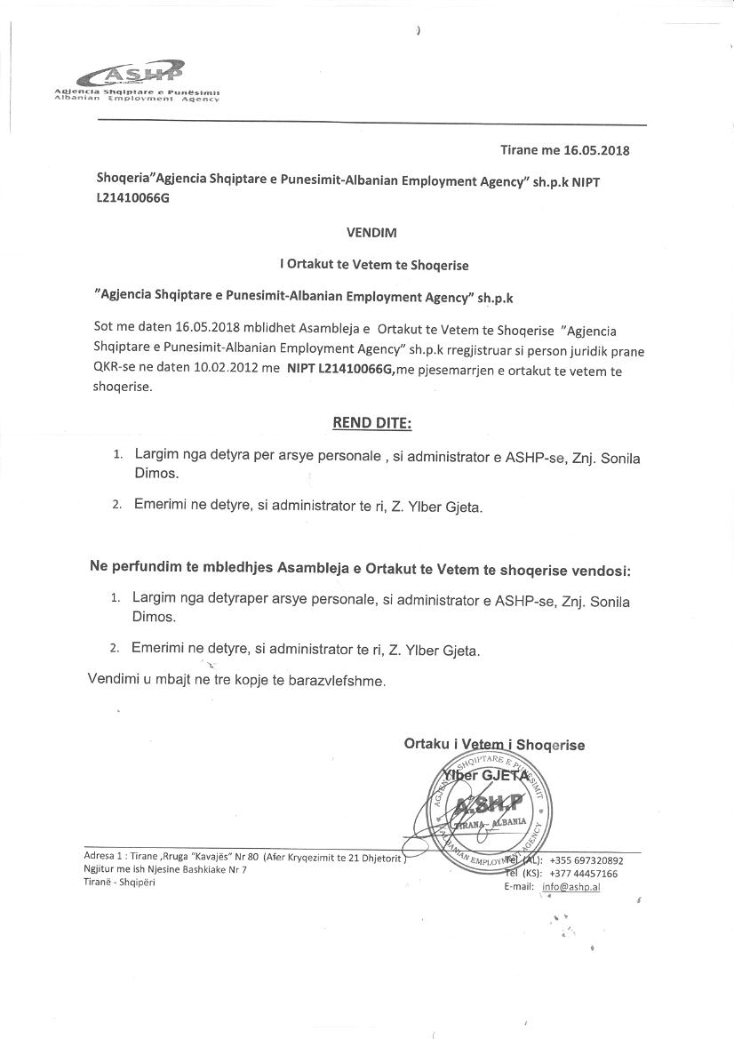 → Ekstrakt Historik i Regjistrit Tregtar, date 25.12.2021 → Vendimi i asamblese se ortakeve, date 17.02.2012 → Vendimi i asamblese se ortakeve, date 05.03.2012 → Vendimi i asamblese se ortakeve, date 15.03.2012 → Vendimi i asmablese se ortakeve, date 31.10.2012 → Vendimi i asamblese se ortakeve, date 03.05.2016 → Vendimi i asmablese 23.02.2016 → Vendimi i asamblese se ortakeve, date 24.11.2016 → Vendimi i asamblese se ortakeve, date 19.03.2018 → Vendimi i asamblese se ortakeve, date 16.05.2018 → Vendimi i asamblese se pergjithshme , date 22.01.2019 → Vendimi i asambleses se ortakeve, date 18.06.2018 → Vendimi i asambelse se ortakeve, date 04.02.2015 |