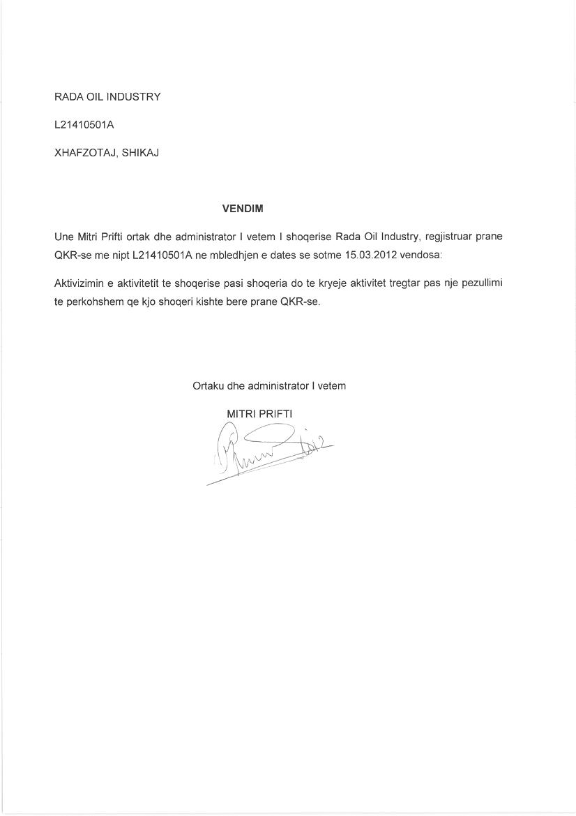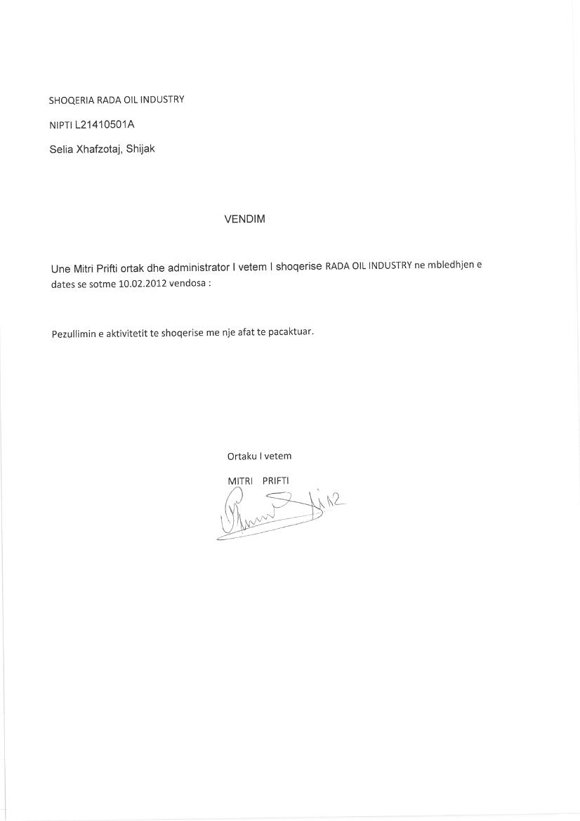 | Çështje Ligjore: | I. Me date 10.02.2012, me vendim te ortakut dhe administratorit, u pezullua aktiviteti i shoqerise me nje afat te pacaktuar. Statusi kaloi nga: “Aktiv” ne “Pezulluar”. II. Me date 15.03.2012, me vendim te ortakut dhe administratorit, u aktivizua veprimtaria e shoqerise. Statusi u kthye ne: “Aktiv”. III. Me date 24.03.2014, me ane Urdherit Nr. 175 Dosje, Nr. 175/6 Prot, leshuar nga Shoqeria Permbarimore “3H”sh.p.k, drejtuar QKR, u urdherua bllokimi i kuotave dhe i te drejtave qe rrjedhin nga zoterimi i kuotave per debitorin “ Rada Oil Industry”, me NUIS (NIPT)L21410201A dhe perfaqesues ligjor Mitri Prifti. IV. Me date 07.07.2014, me ane te urdherit Nr. 175 Dosje, Nr. 175/10 Prot, leshuar nga Shoqeria Permbarimore Gjyqesore “3H” sh.p.k, drejtuar QKR, u urdherua heqja e sekuestros konservative vene mbi te drejtat qe rrjedhin nga zoterimi i kuotave te subjektit “ Rada Oil Industry”, me NUIS (NIPT) - L21410501A dhe perfaqesues ligjor Mitri Prifti, vendosur me shkresen nr.175/6 Prot., date 24.03.2014. V. Me date 02.08.2019, me ane te Urdhrit Nr. 485 Prot, leshuar nga permbaruesja gjyqesore private Ina Barjamaj, u bllokuan kapitalet e subjektit, shoqeria Rada Oil Industry SHPK, me NUIS (NIPT) L21410501A. VI. Me date 21.08.2019, me ane te urdhërit Nr. 485 Prot, protokolluar nga QKB me Nr.11111 Prot., datë 21.08.2019, lëshuar nga Përmbaruese Gjyqësore Private Ina Barjamaj, u urdherua heqja e masës së sekuestros të vendosur mbi kapitalet e subjektit, shoqëria “Rada Oil Industry” sh.p.k., me NUIS (Nipt)– L21410501A. |