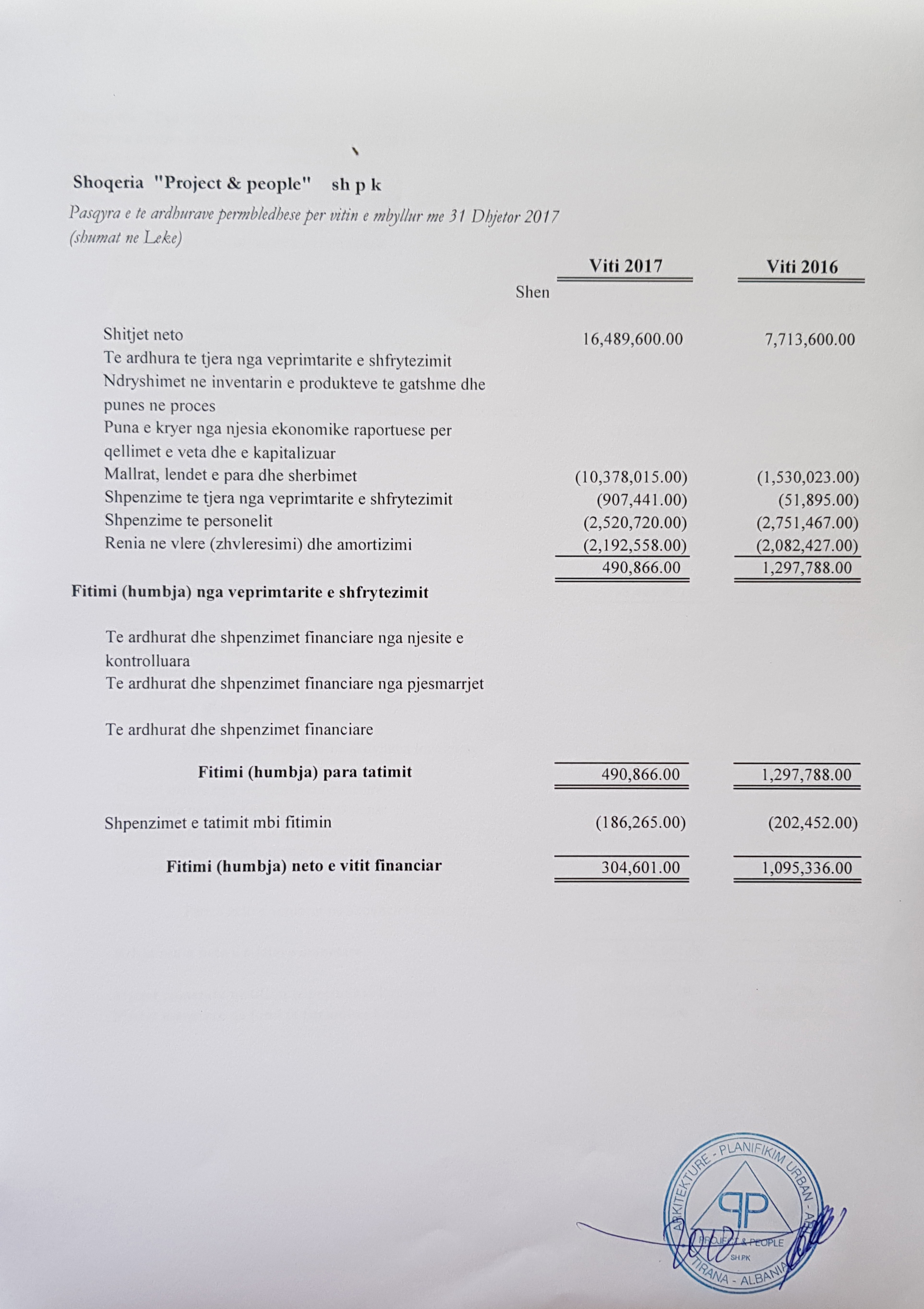 Xhiro Vjetore(Lekë) 2019:1 390 000,00 Xhiro Vjetore(Lekë) 2018:2 118 640,00 Xhiro Vjetore(Lekë) 2017:16 489 600,00 Xhiro Vjetore(Lekë) 2016:7 713 600,00 Xhiro Vjetore(Lekë) 2015:8 297 646,00 Xhiro Vjetore(Lekë) 2014: 3 812 024,00 Xhiro Vjetore(Lekë) 2013: 10 881 370,00 Xhiro Vjetore(Lekë) 2012: 3 237 300,00 |