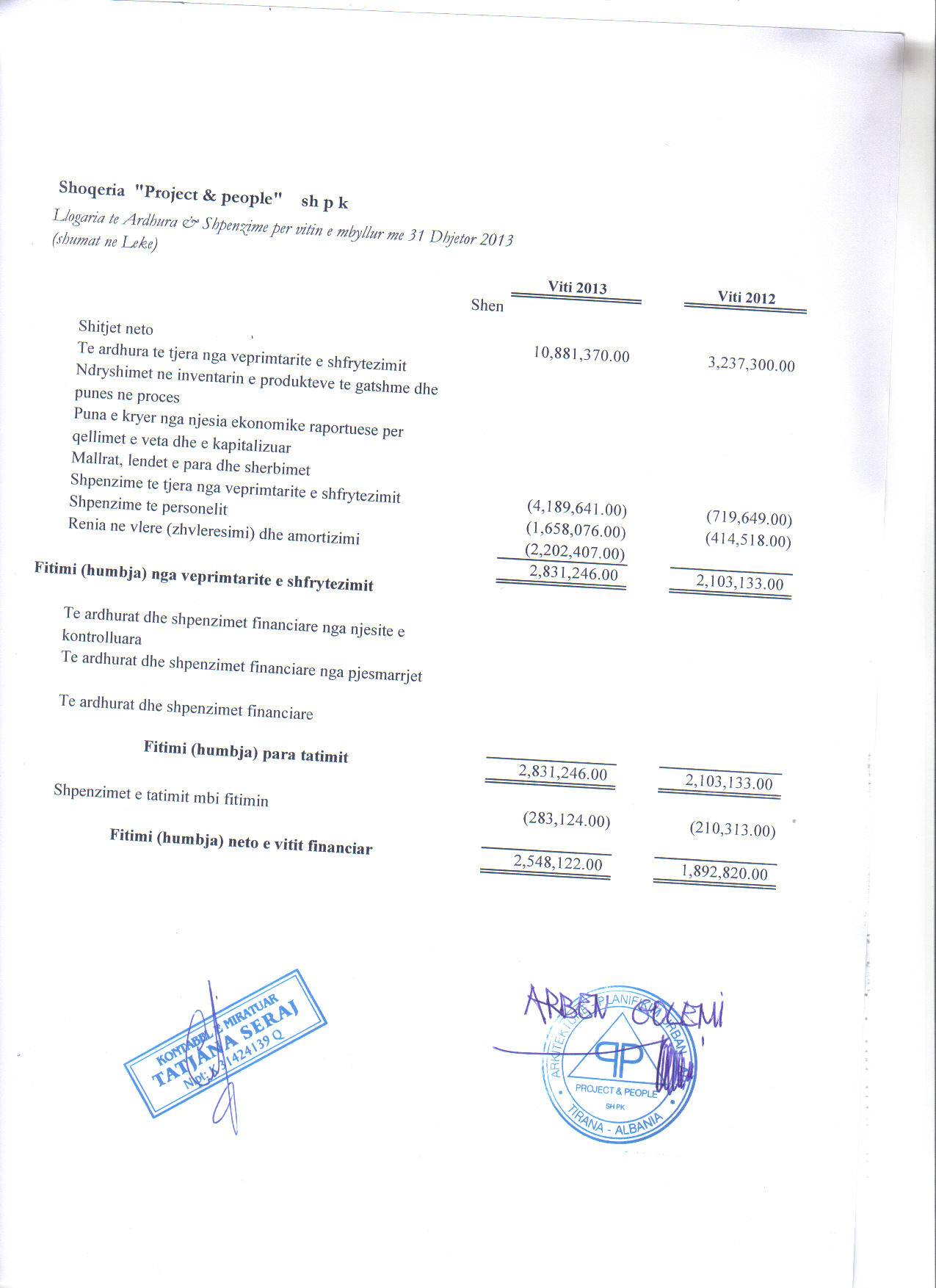 -1 366 641,00 Fitimi para Tatimit(Lekë) 2019: -2 268 508,00 Fitimi para Tatimit(Lekë) 2018: -1 608 826,00 Fitimi para Tatimit(Lekë) 2017: 490 866,00 Fitimi para Tatimit(Lekë) 2016: 1 297 788,00 Fitimi para Tatimit(Lekë) 2015: 2 569 918,00 Fitimi para Tatimit(Lekë) 2014: 975 752,00 Fitimi para Tatimit(Lekë) 2013: 2 831 246,00 Fitimi para Tatimit(Lekë) 2012: 2 103 133,00 |