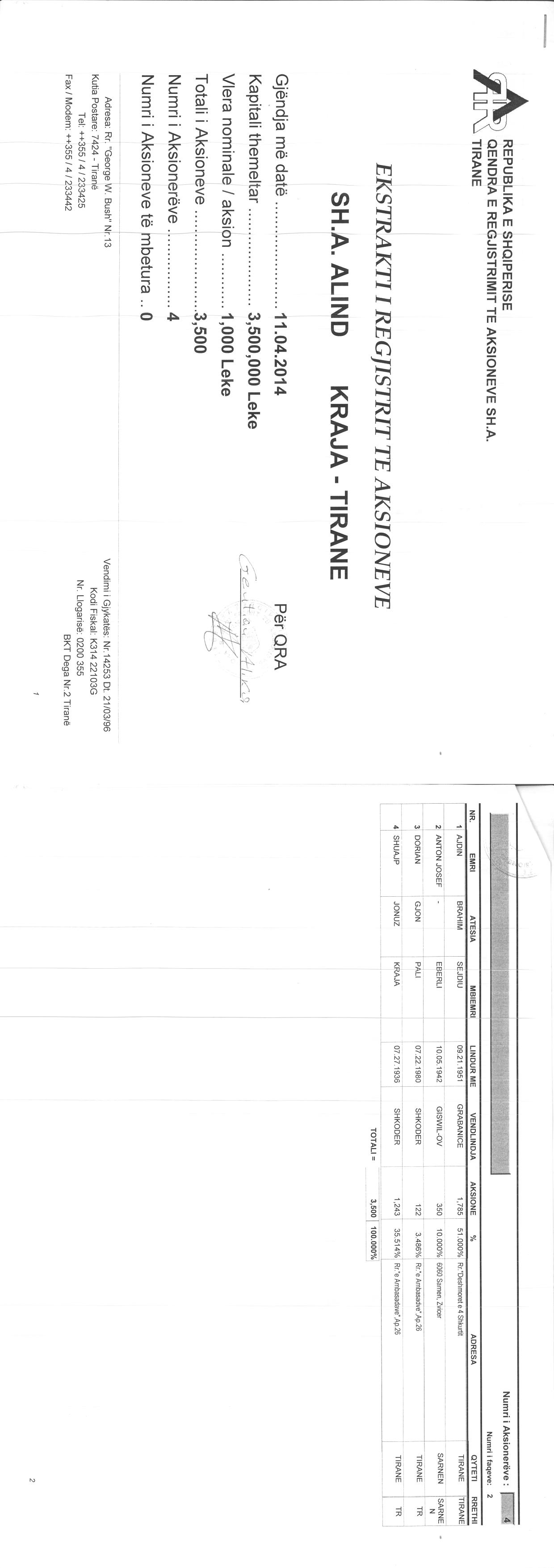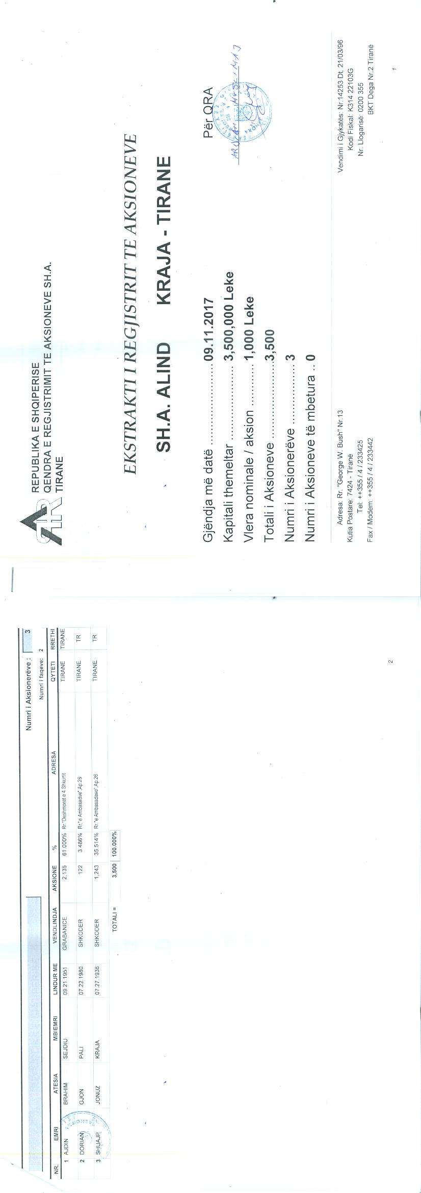 → Ekstrakti Historik i Regjistrit Tregtar date 27.01.2023 → Statuti i Shoqerise → Kontrate Dhurimi Aksionesh date 23.05.2012 → Kontrate Shitblerje Aksionesh date 26.07.2012 → Kontrate Dhurimi Aksionesh date 15.01.2014 → Kontrate Dhurimi Aksionesh date 30.04.2014 → Kontrate Dhurimi Aksionesh date 17.06.2014 → Kontrate Dhurimi Aksionesh date 03.07.2014 → Kontrate Dhurimi Aksionesh date 14.10.2014 → Ekstrakti Historik i Regjistrit te Pronareve Perfitues, terhequr date 27.01.2023 → Ekstrakti i Regjistrit te Aksioneve, date 04.11.2014 → Ekstrakti i Regjistrit te Aksioneve, date 23.07.2015 → Ekstrakti i Regjistrit te Aksioneve, date 29.08.2017 → Ekstrakti i Regjistrit te Aksioneve, date 09.07.2017 → Ekstrakti i Regjistrit te Aksioneve, date 11.09.2017 → Ekstrakti i Regjistrit te Aksioneve, date 14.12.2017 → Ekstrakti i Regjistrit te Aksioneve, date 26.01.2018 → Urdher per Venie Sekuestro date 25.09.2017 → Urdher per Heqje Sekuestro date 24.01.2018 → Ekstrakt Historik i Regjistrit Tregtar date 19.02.2026 |
